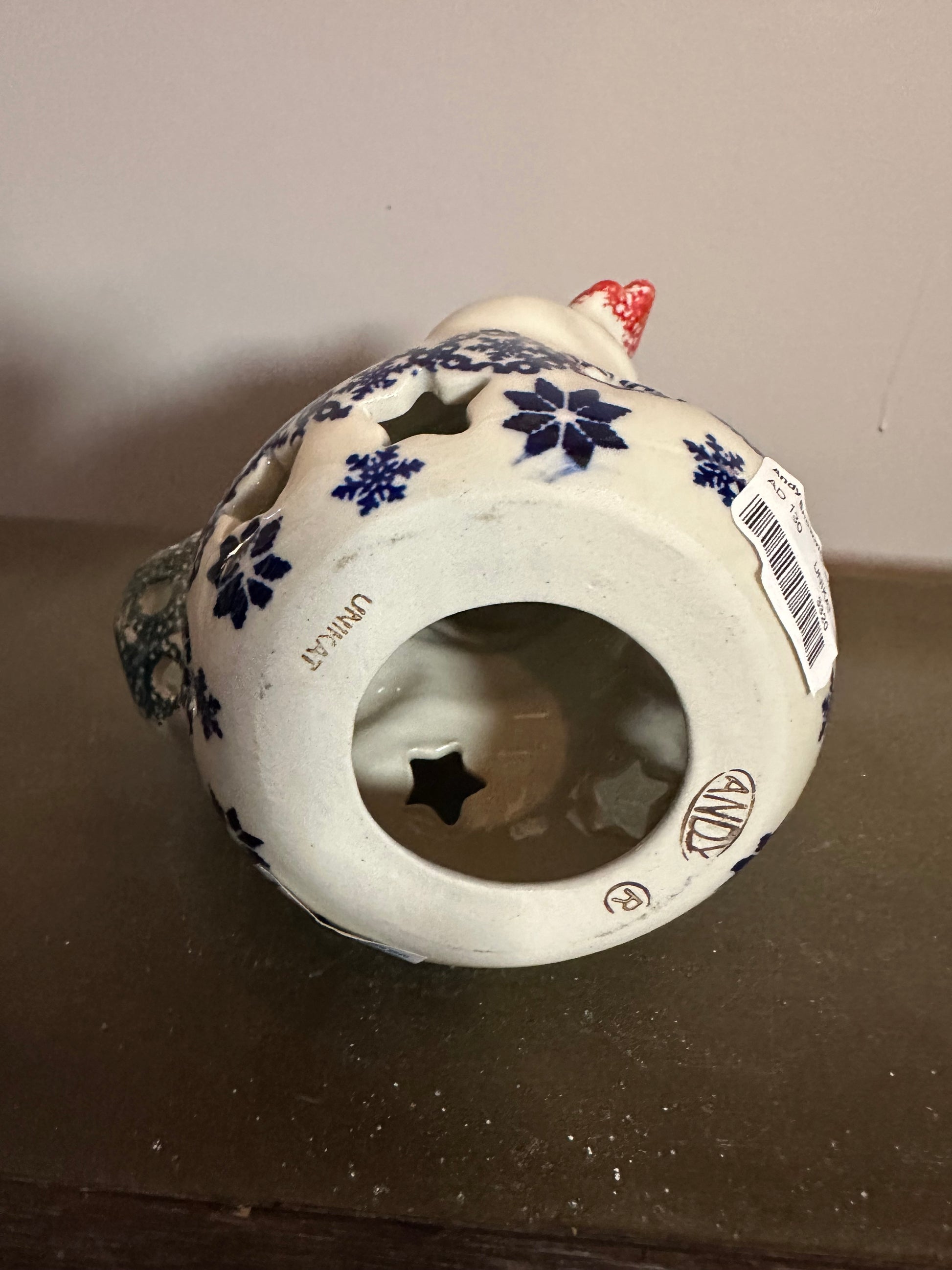 Andy Factory. Christmas Trees & Snowflakes, Holding Tree, Bird on Hat, 7" Tall, 5.5" at widest point. Handmade and Hand Painted in Boleslawiec, Poland. Oven Safe to 480 degrees, microwave, dishwasher, freezer safe. No lead nor cadmium. Naturally Nonstick.