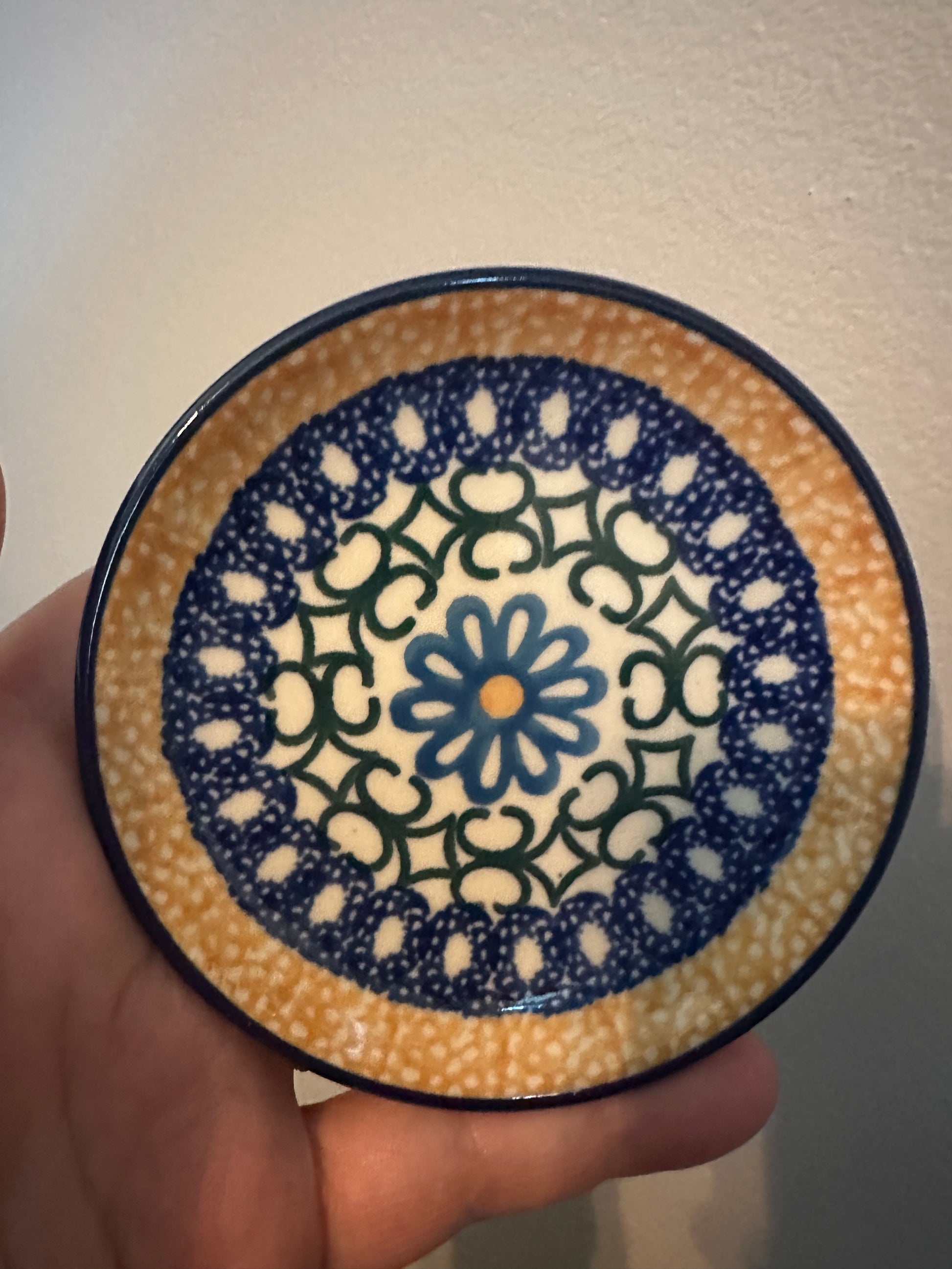 Ceramika Artystyczna Factory. Daisy Stepping Stones, Mini Plate/Coaster. 4" Diameter. Handmade and Hand Painted in Boleslawiec, Poland. Oven Safe to 480 degrees, microwave, dishwasher, freezer safe. No lead nor cadmium. Naturally Nonstick.