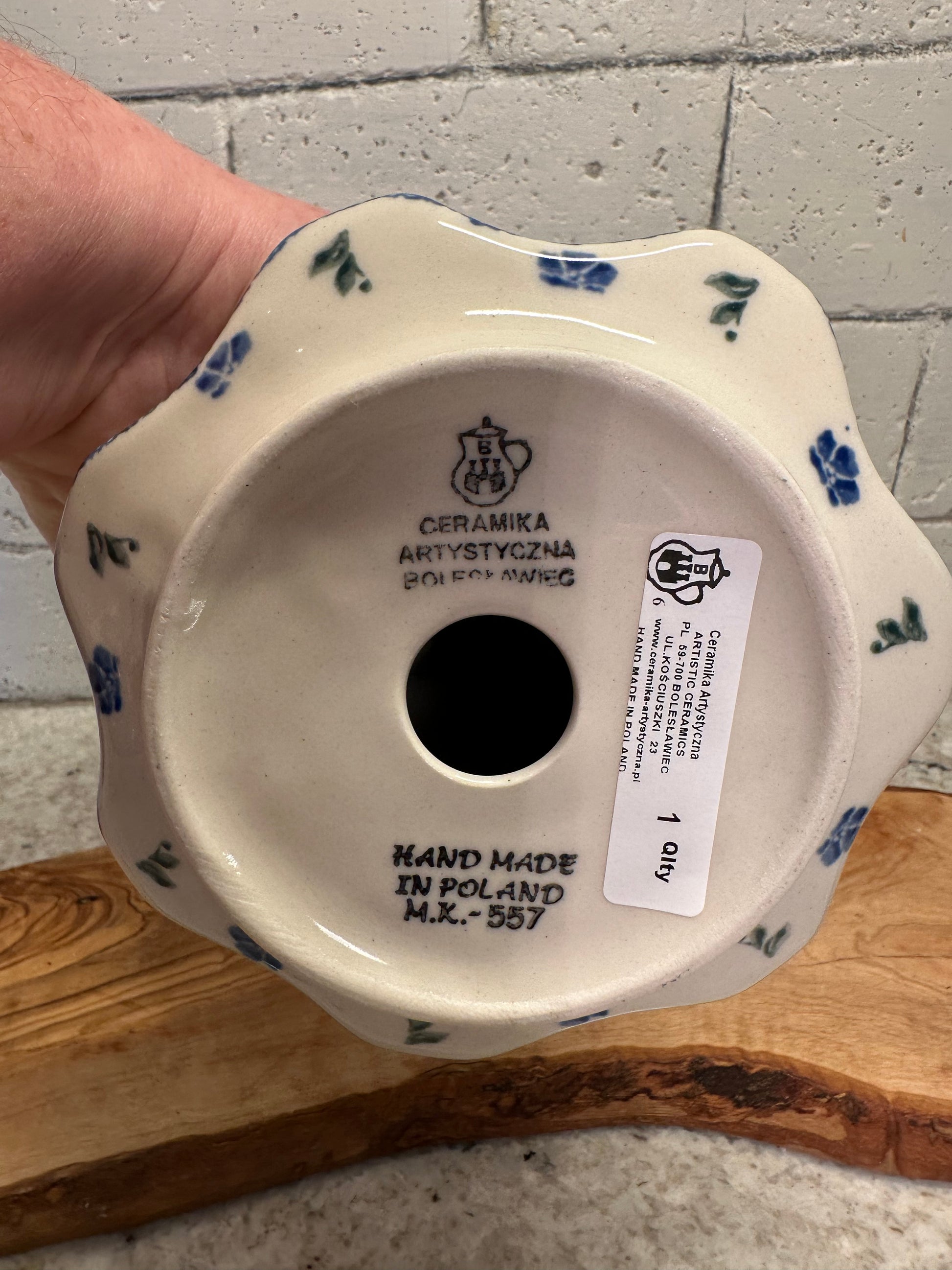 Ceramika Artystyczna Factory. Floral Bluebird with Vines, 5" Diameter x 8" Tall Tree. Handmade and Hand Painted in Boleslawiec, Poland. Oven Safe to 480 degrees, microwave, dishwasher, freezer safe. No lead nor cadmium. Naturally Nonstick.