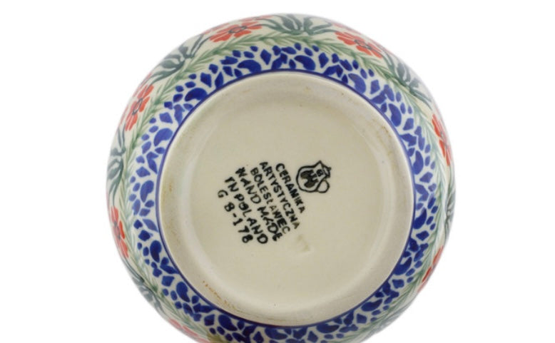 Ceramika Artystyczna Factory. Red April Showers, Loop Mug/Bowl, 16 oz Capacity, 6.25" x 4.5" x 5.5". Handmade and Hand Painted in Boleslawiec, Poland. Oven Safe to 480 degrees, microwave, dishwasher, freezer safe. No lead nor cadmium. Naturally Nonstick.
