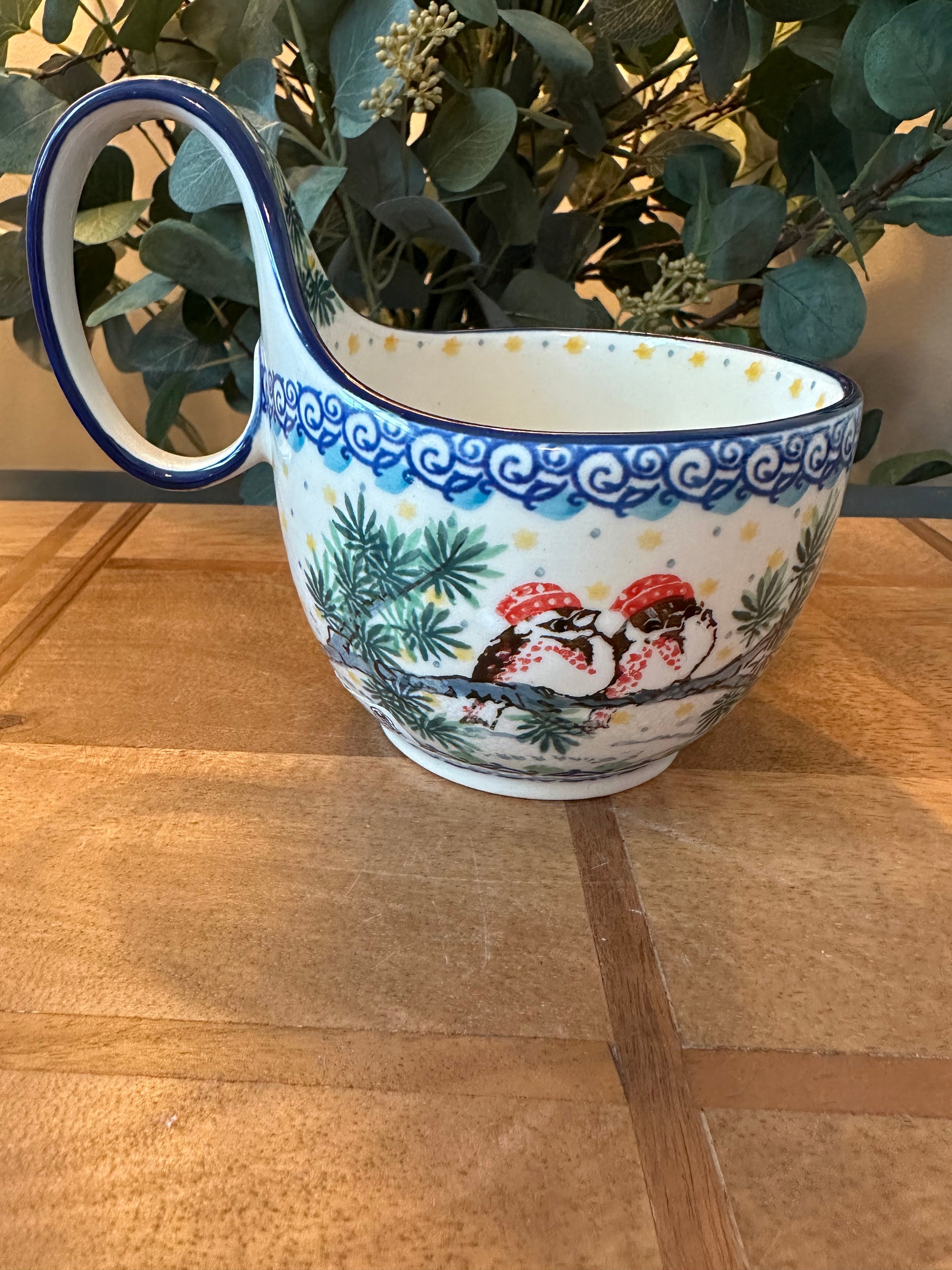 Ceramika Artystyczna Factory. Unikat Cozy Bullfinch, Loop Mug/Bowl, 16 oz. Handmade and Hand Painted in Boleslawiec, Poland. Oven Safe to 480 degrees, microwave, dishwasher, freezer safe. No lead nor cadmium.