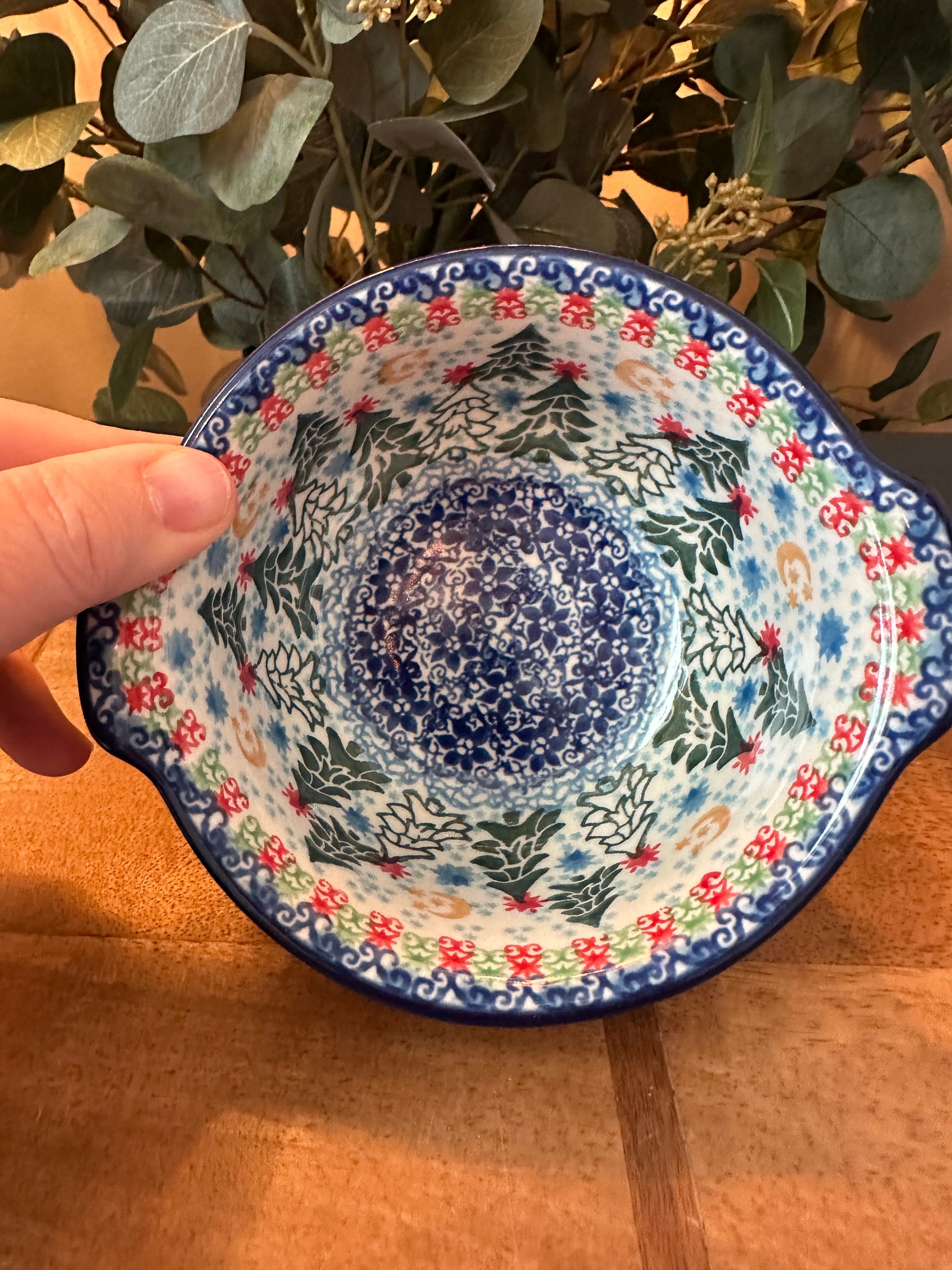 Ceramika Artystyczna Factory. Unikat Glowing Christmas Trees, Bouillon Cup, 11 oz. 5.28" x 5" x 2.5". Handmade and Hand Painted in Boleslawiec, Poland. Oven Safe to 480 degrees, microwave, dishwasher, freezer safe. No lead nor cadmium.