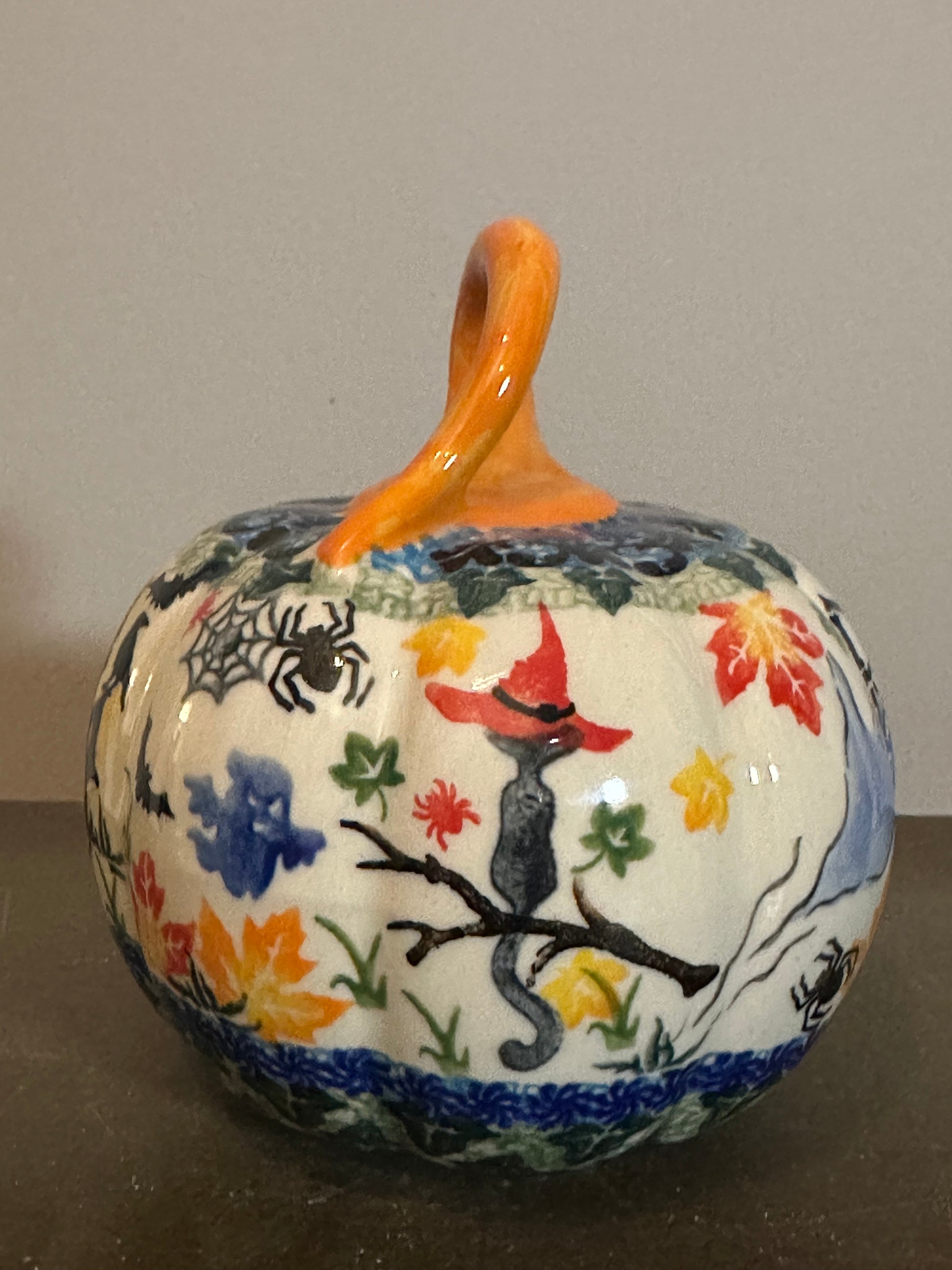 Kalich Factory. Magic Moonlight Mini Pumpkin 5.5" Tall x 5.5" Diameter. Handmade and Hand Painted in Boleslawiec, Poland. Oven Safe to 480 degrees, microwave, dishwasher, freezer safe. No lead nor cadmium. Naturally Nonstick.