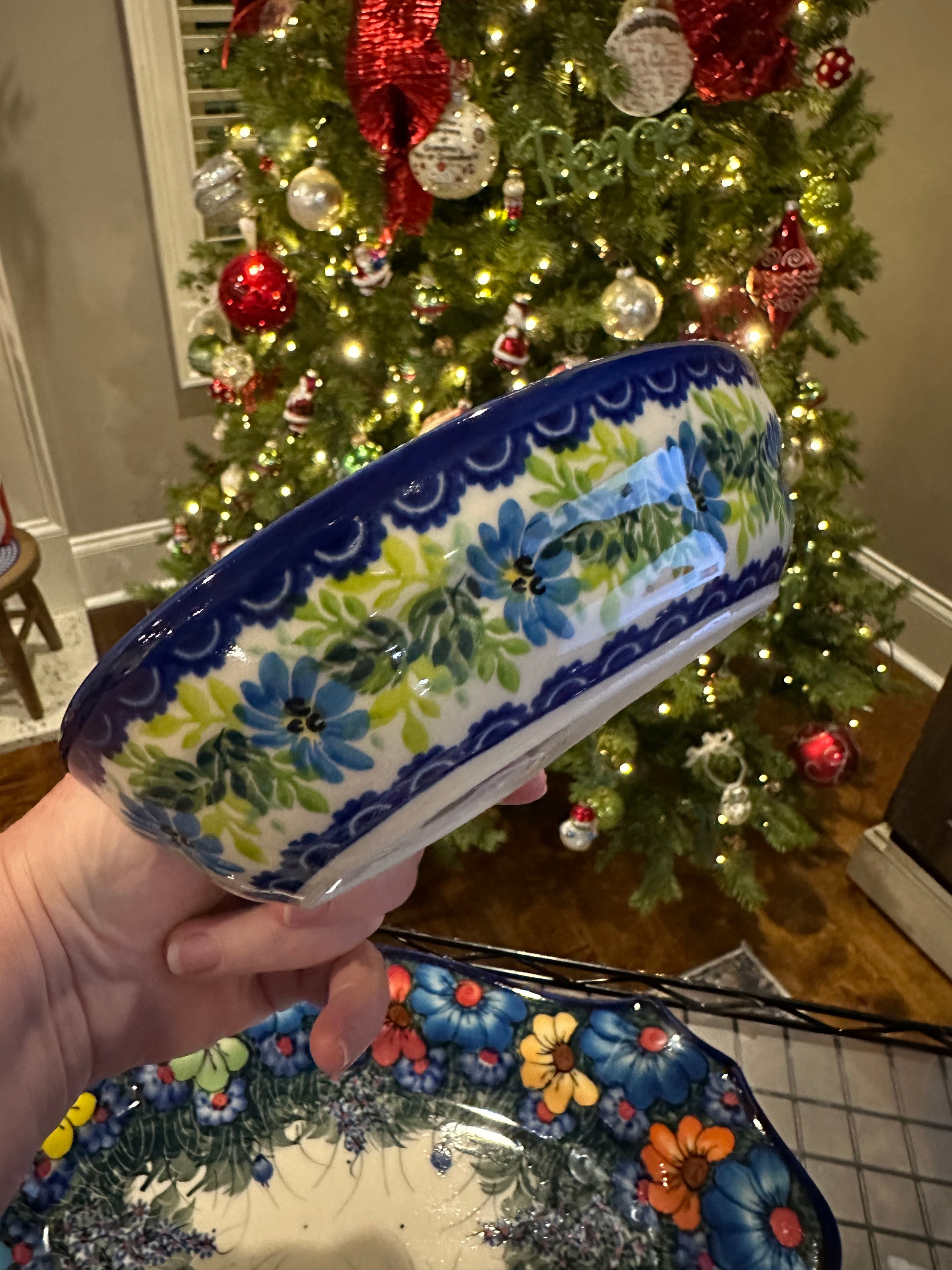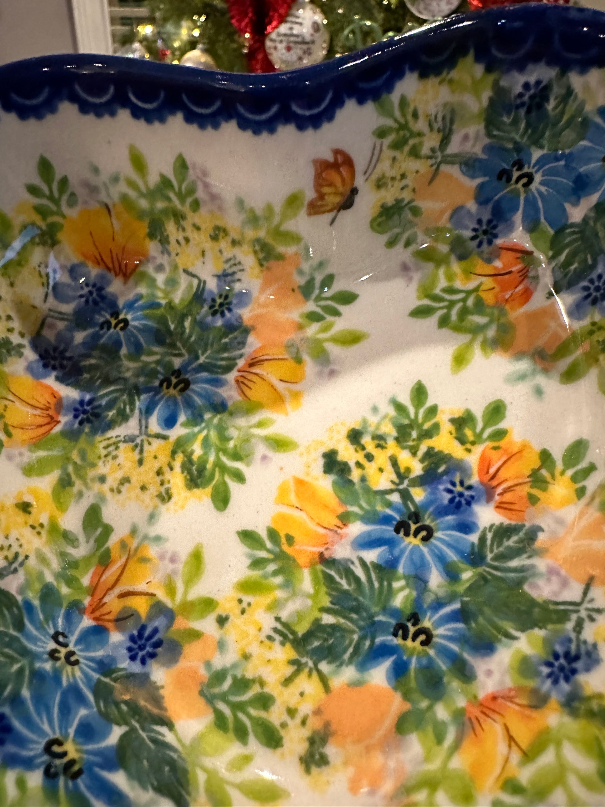 Kalich Factory. Unikat Art Level 1, Orange and Yellow Butterfly Heart Bowl. 6" x 6" x 1.75". Handmade and Hand Painted in Boleslawiec, Poland. Oven Safe to 480 degrees, microwave, dishwasher, freezer safe. No lead nor cadmium. Naturally Nonstick.