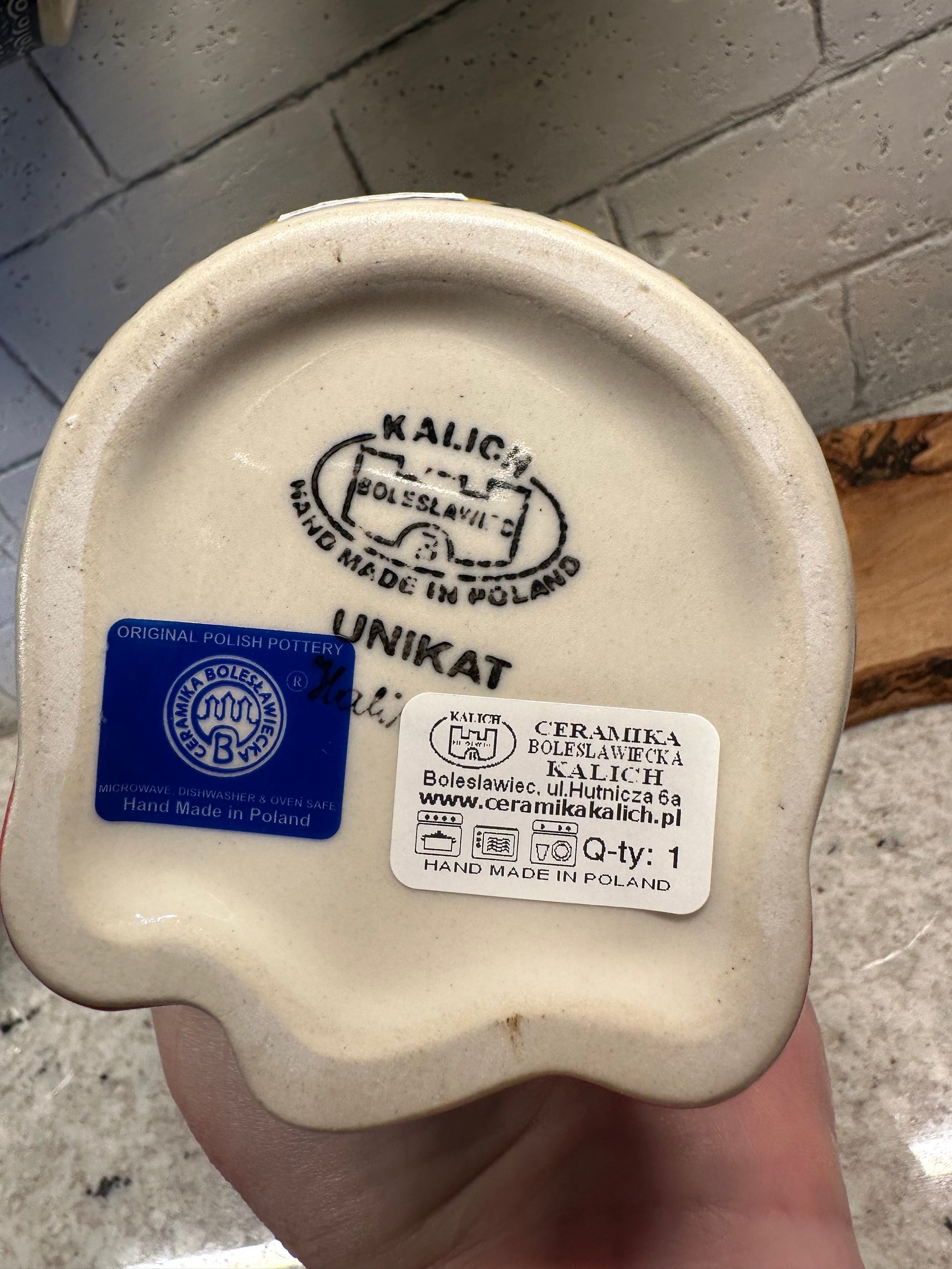 Kalich Factory. Signature Unikat, Art Level Gnome Cookie Jar, 8" x 5". Handmade and Hand Painted in Boleslawiec, Poland. Oven Safe to 480 degrees, microwave, dishwasher, freezer safe. No lead nor cadmium. Naturally Nonstick.