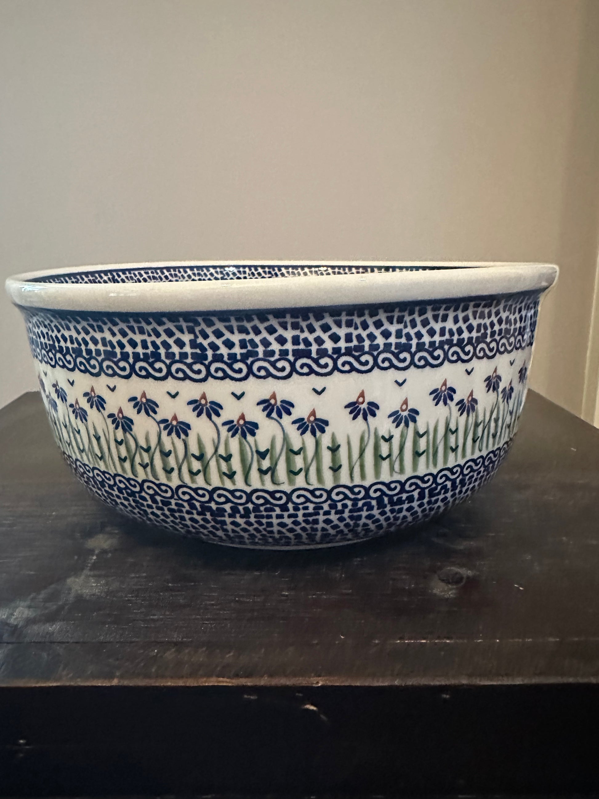 Manufaktura Factory. Addie Jo Mixing/Serving Bowl. 11" Diameter x 5" Deep. Handmade and Hand Painted in Boleslawiec, Poland. Oven Safe to 480 degrees, microwave, dishwasher, freezer safe. No lead nor cadmium. Naturally Nonstick.