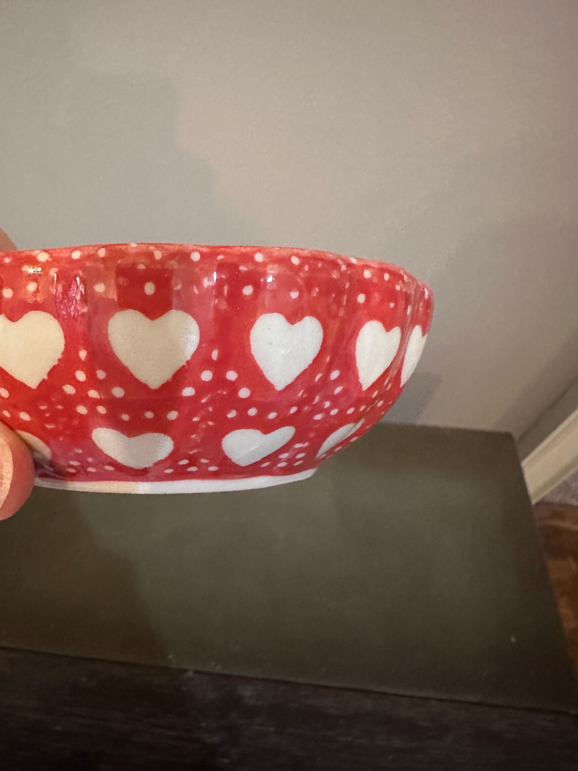 Manufaktura Factory. Heartfelt, Scallop Bowl. 4.75" Diameter. Handmade and Hand Painted in Boleslawiec, Poland. Oven Safe to 480 degrees, microwave, dishwasher, freezer safe. No lead nor cadmium. Naturally Nonstick.