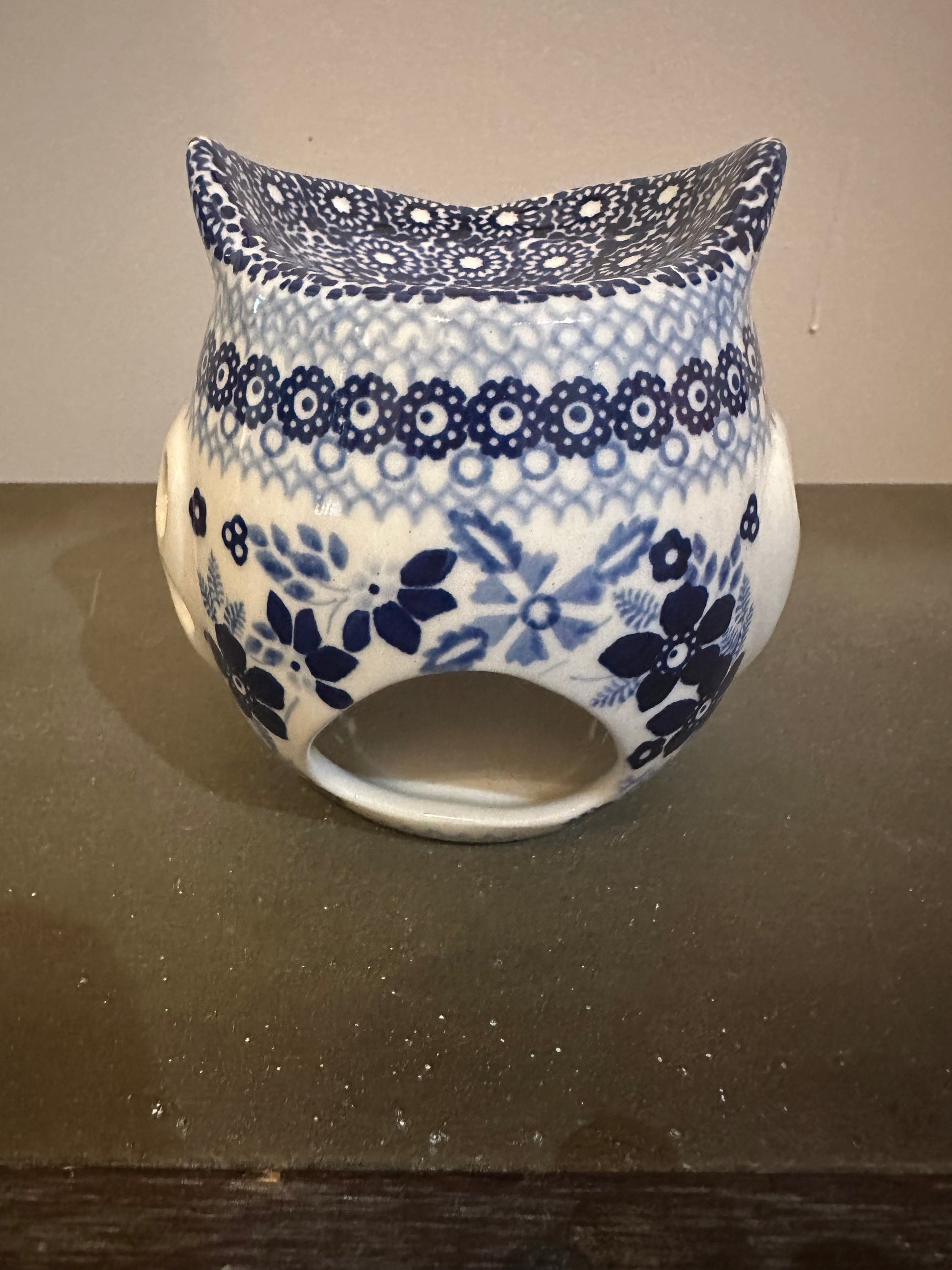 Manufaktura Factory. Indigo Garden, Owl Luminary & Wax Warmer. 4.5" x 4" x 4".