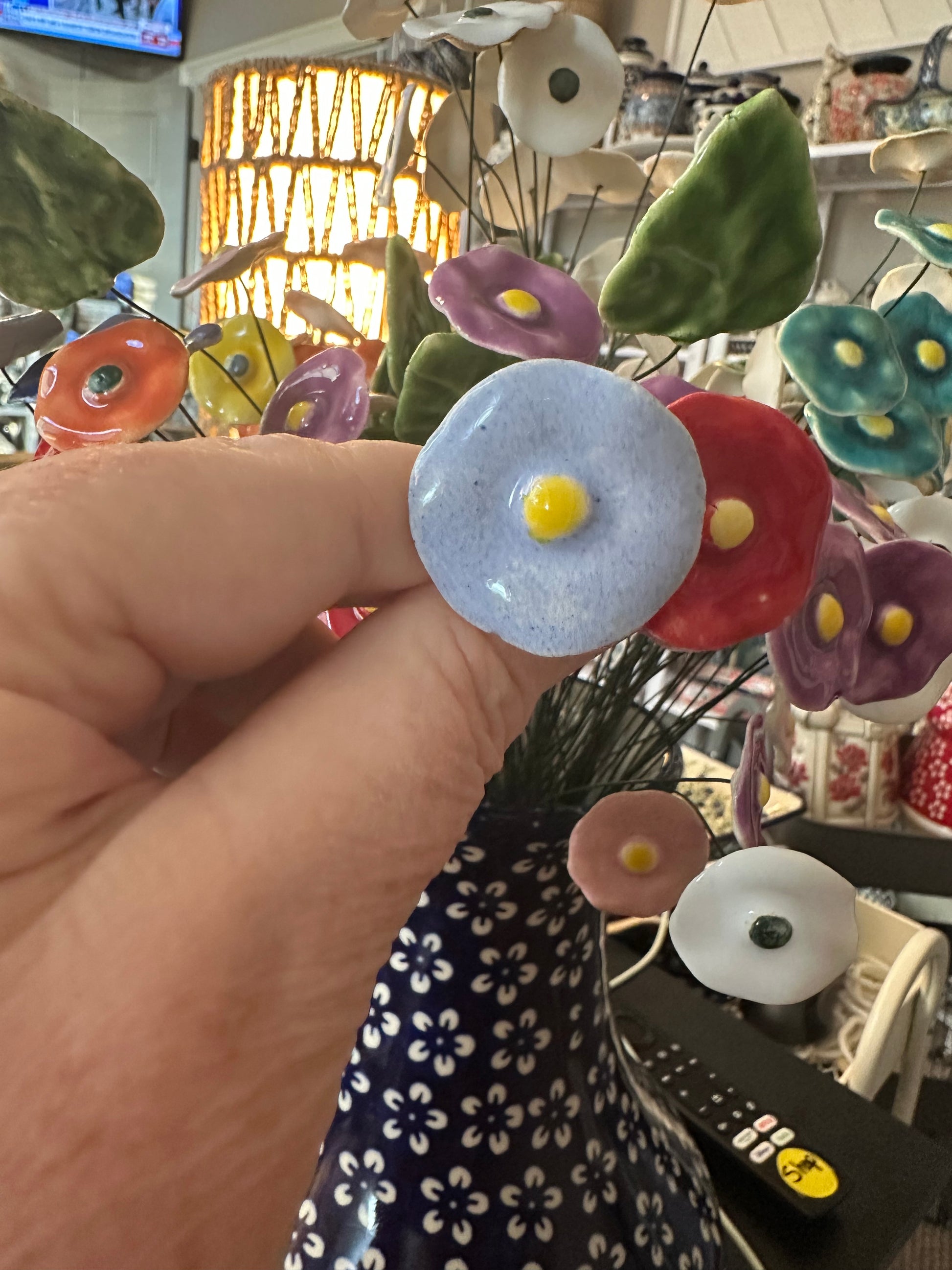Manufaktura Polish Pottery, Light Blue w/Yellow Middle Posy 1" Diameter x 10" floral wire. Price is for 1 individual Posy