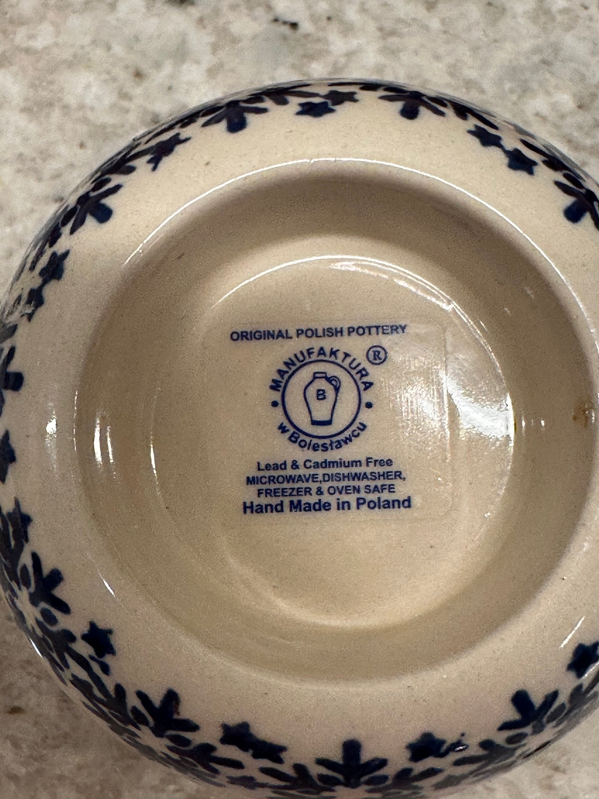 Manufaktura Factory. Ornaments & Bows Votive Holder. Handmade and Hand Painted in Boleslawiec, Poland. Oven Safe to 480 degrees, microwave, dishwasher, freezer safe. No lead nor cadmium. Naturally Nonstick.