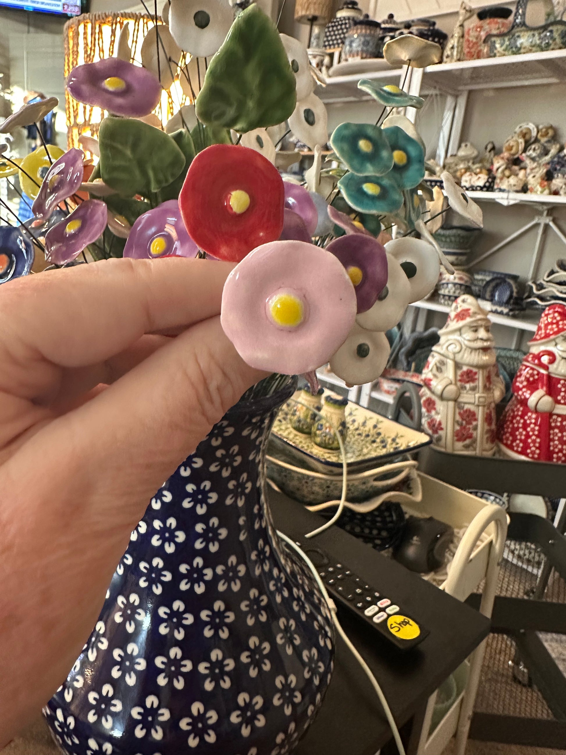 Polish Pottery, Pink w/Yellow Middle, Posy 1" Diameter x 10" floral wire. Price is for 1 individual Posy