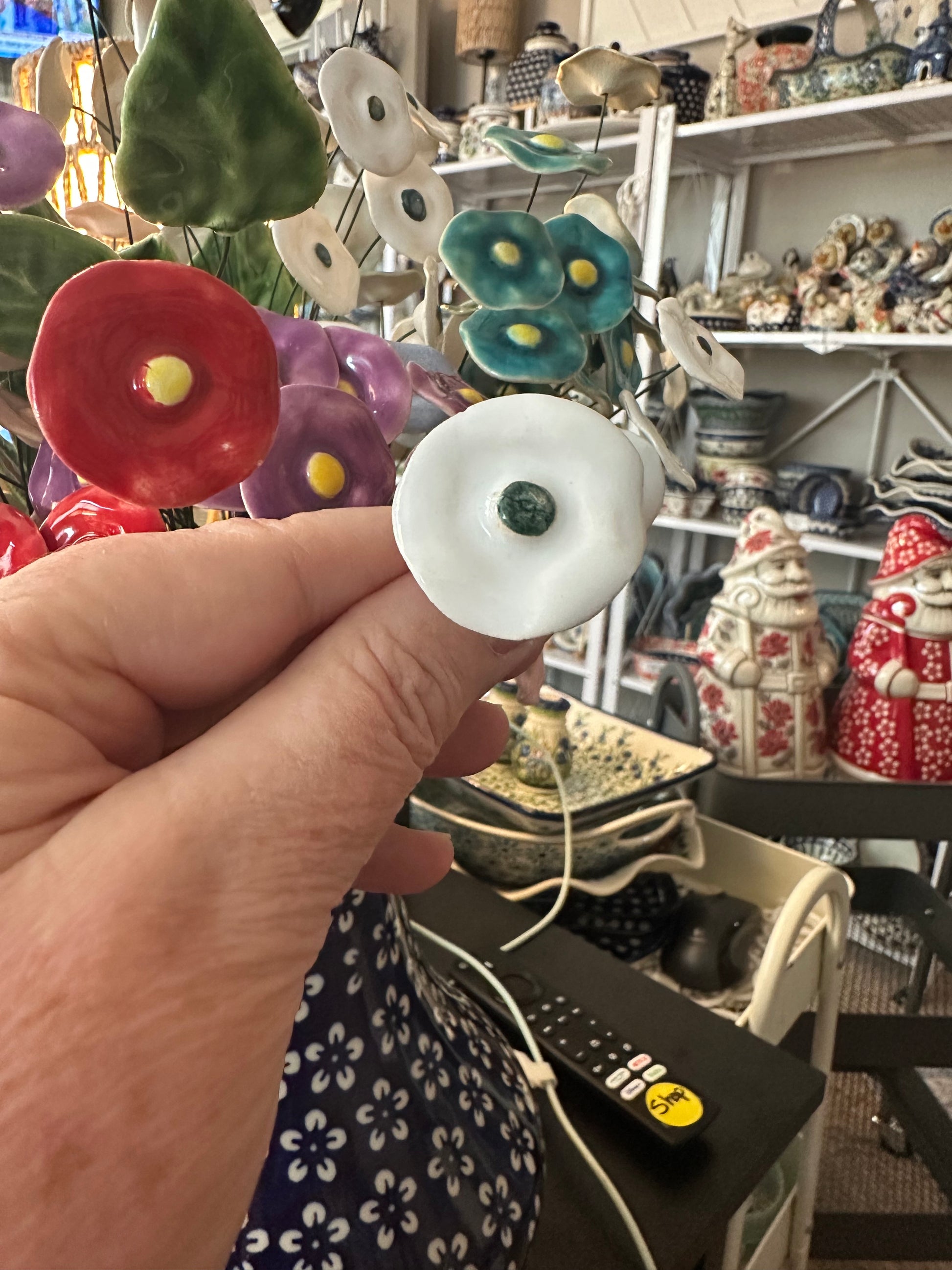 Manufaktura Polish Pottery, White w/Green Middle Posy 1" Diameter x 10" floral wire. Price is for 1 individual Posy