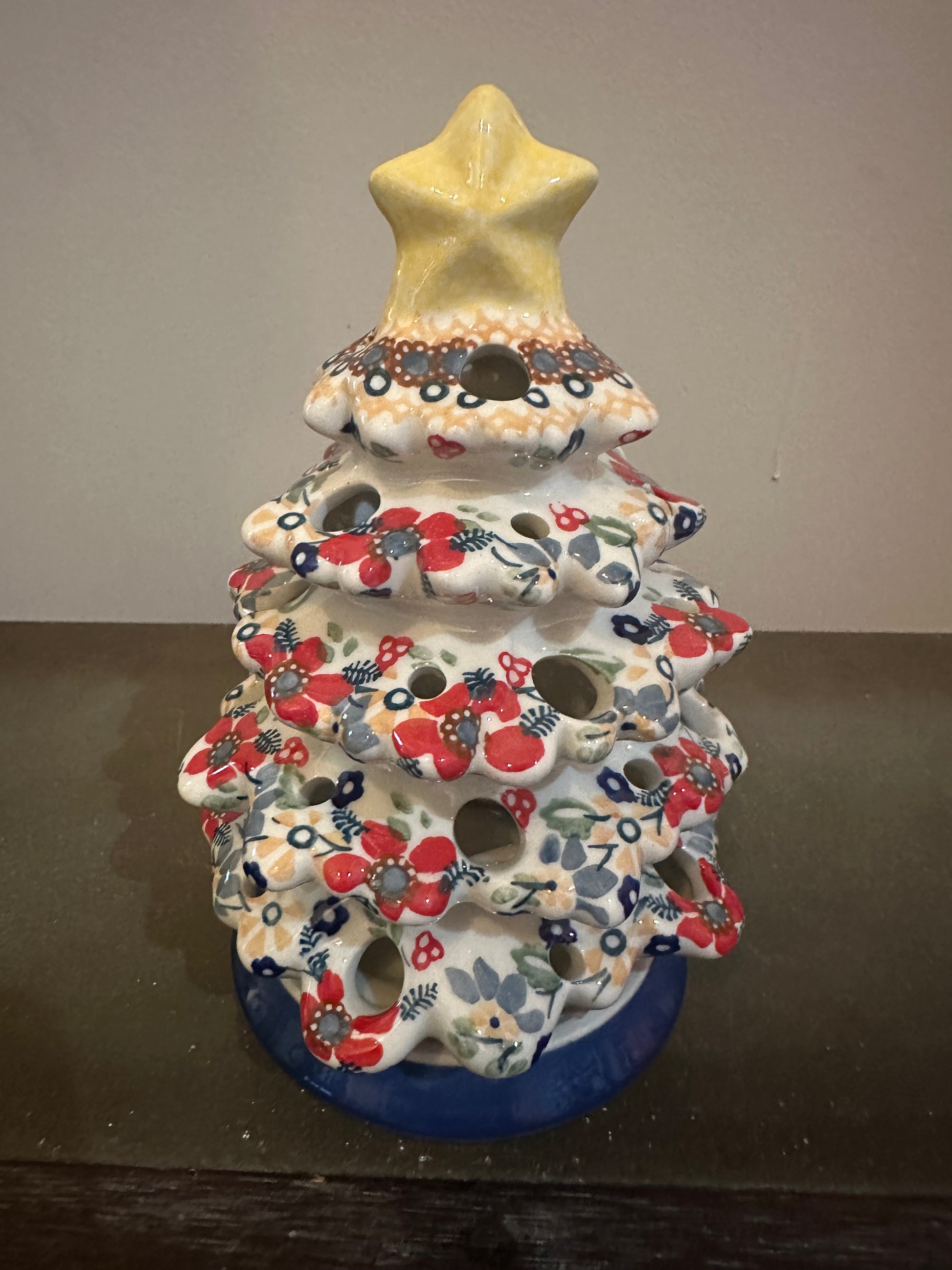 Manufaktura Factory. Posies Christmas Tree. 4.75" x 7.5" Tall. Handmade and Hand Painted in Boleslawiec, Poland. Oven Safe to 480 degrees, microwave, dishwasher, freezer safe. No lead nor cadmium. Naturally Nonstick.