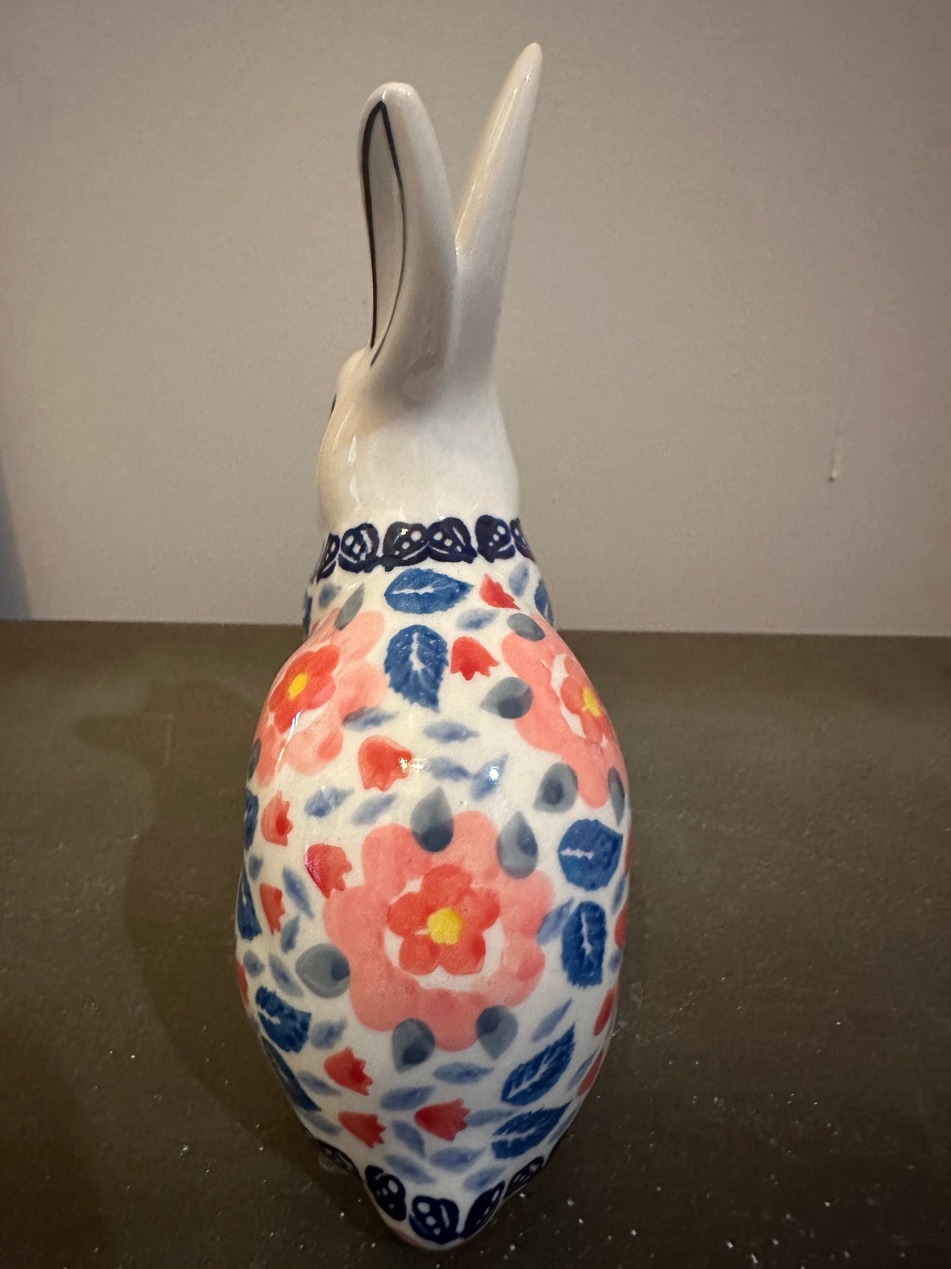 Manufaktura Factory. Sweet Pea Bunny figurine. 2.3 x 4.1 x 6. Handmade and Hand Painted in Boleslawiec, Poland. Oven Safe to 480 degrees, microwave, dishwasher, freezer safe. No lead nor cadmium. Naturally Nonstick.