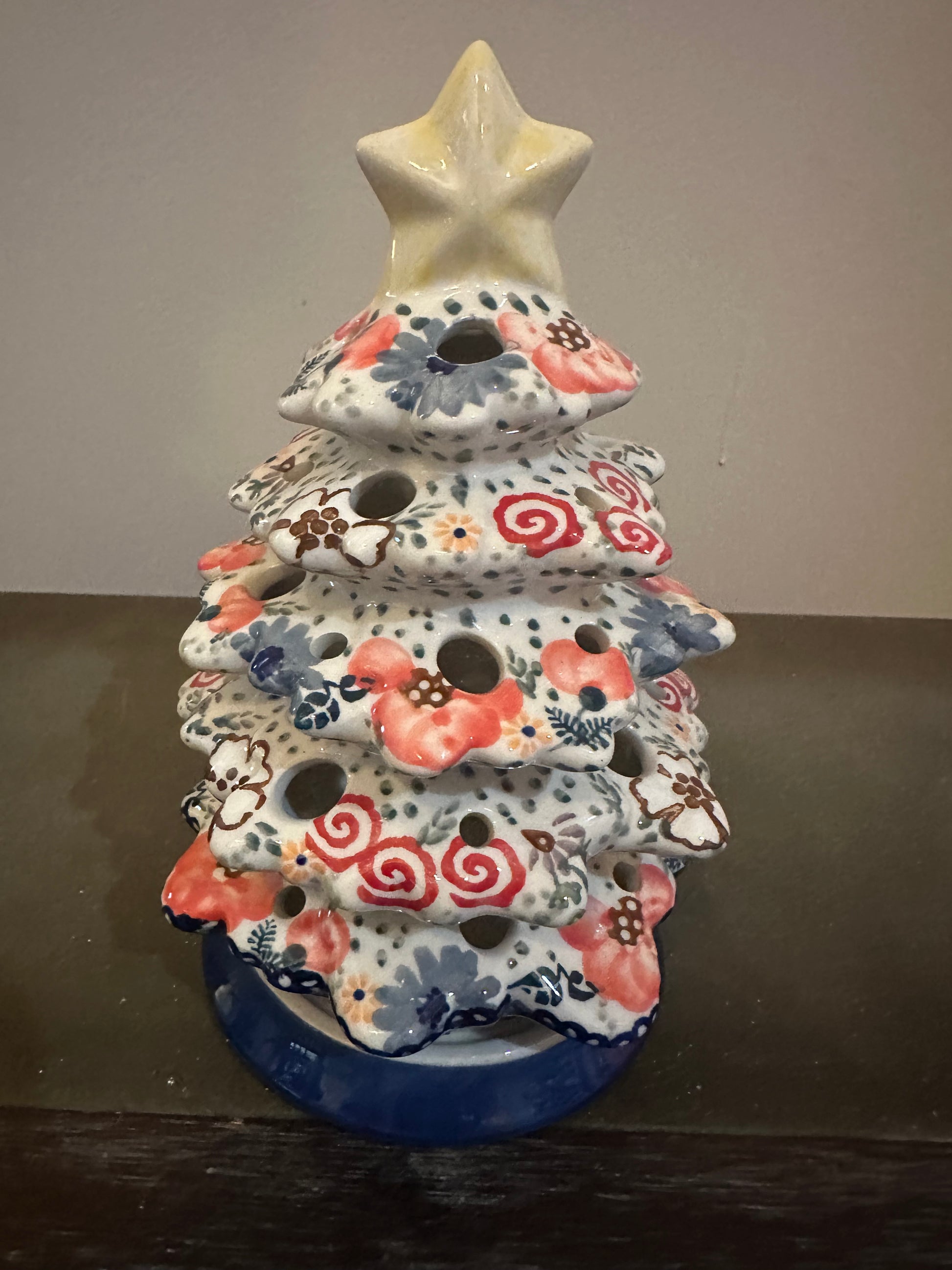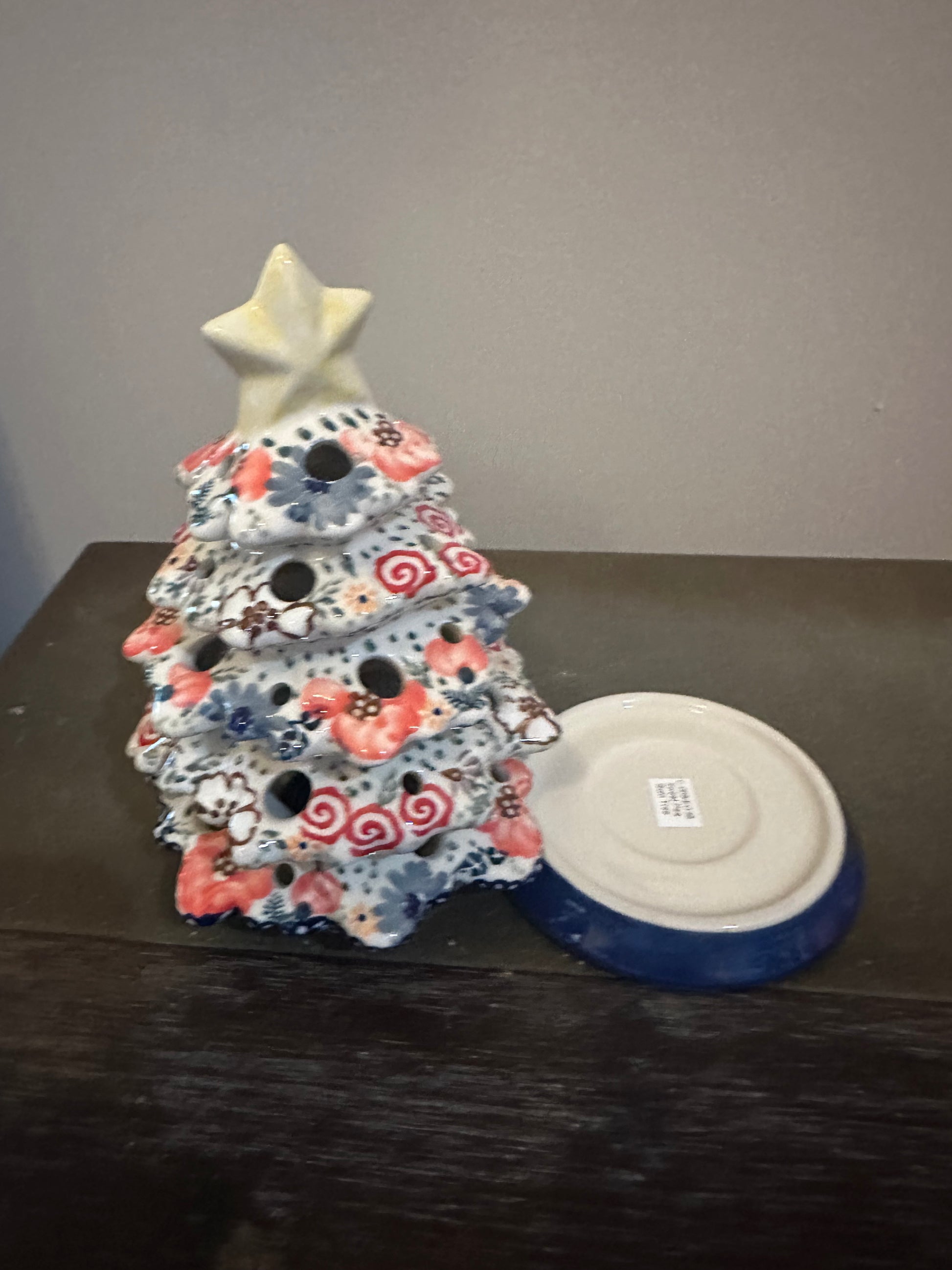 Manufaktura Factory. Sweet Pea Christmas Tree. 4.75" x 7.5". Handmade and Hand Painted in Boleslawiec, Poland. Oven Safe to 480 degrees, microwave, dishwasher, freezer safe. No lead nor cadmium. Naturally Nonstick.