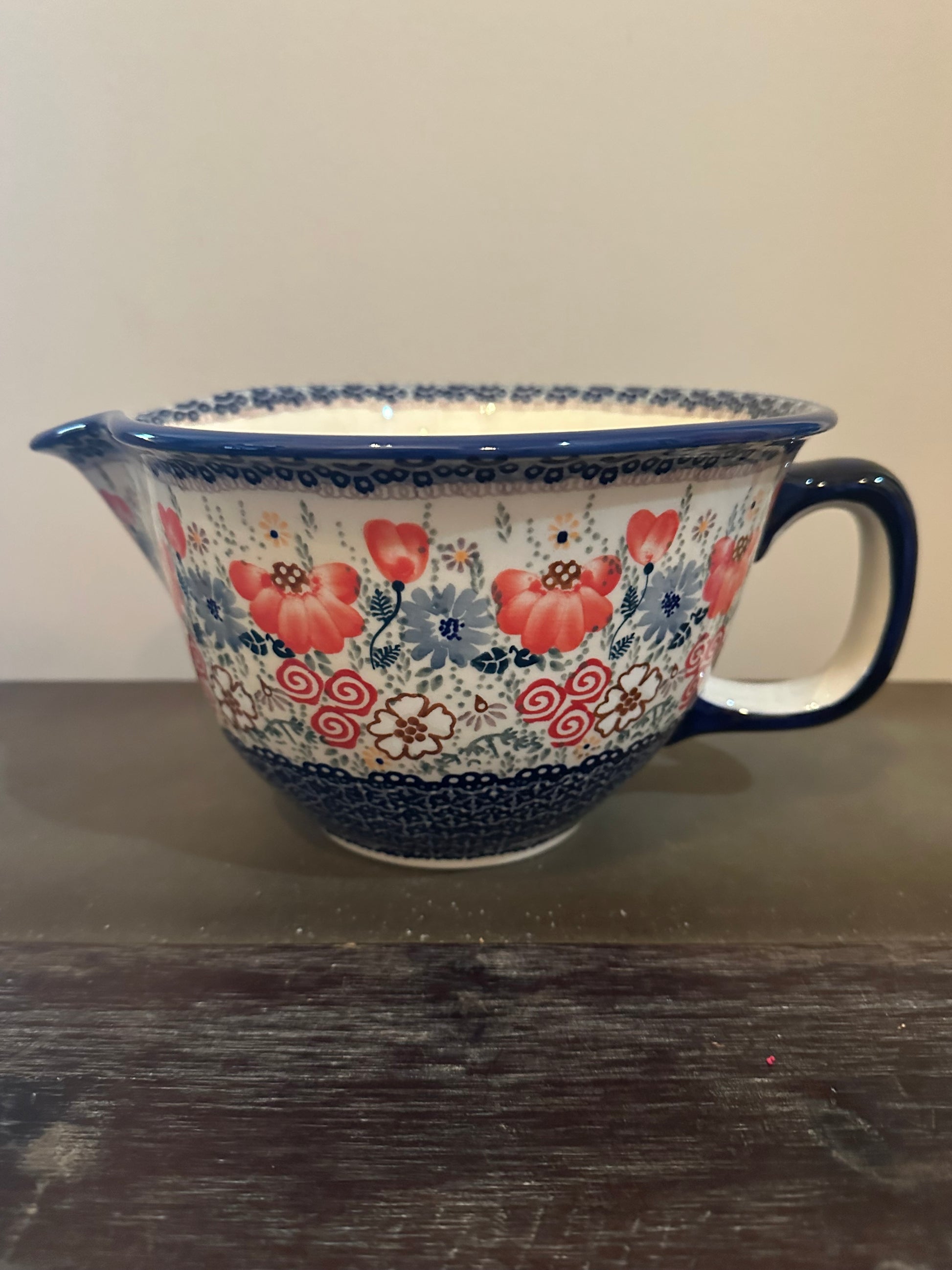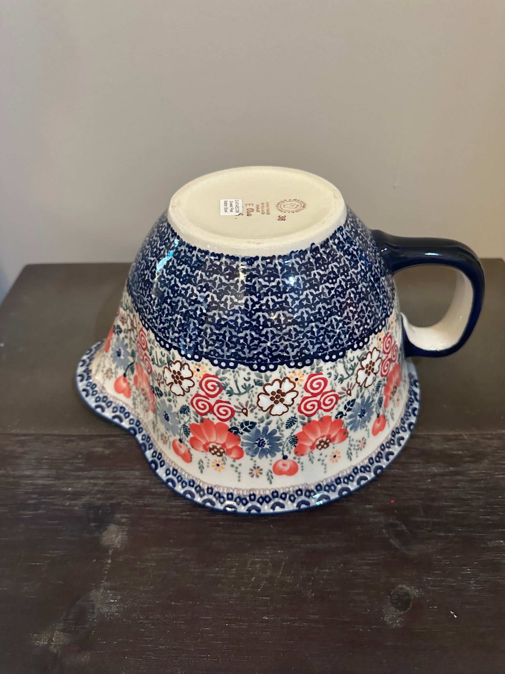 Manufaktura Factory. Sweet Pea Large Batter Bowl. 11" x 9.5" x 5.5". Handmade and Hand Painted in Boleslawiec, Poland. Oven Safe to 480 degrees, microwave, dishwasher, freezer safe. No lead nor cadmium. Naturally Nonstick.