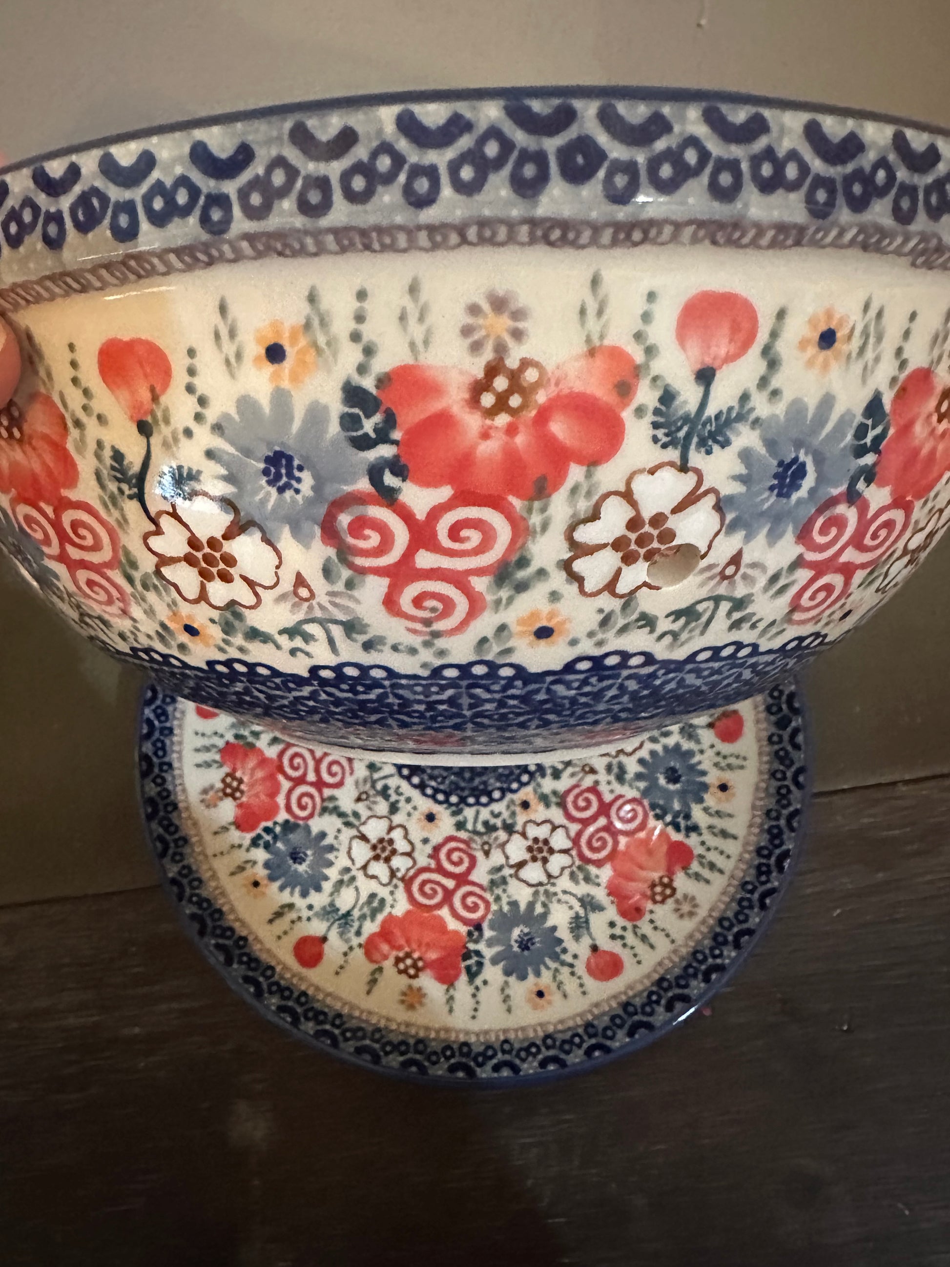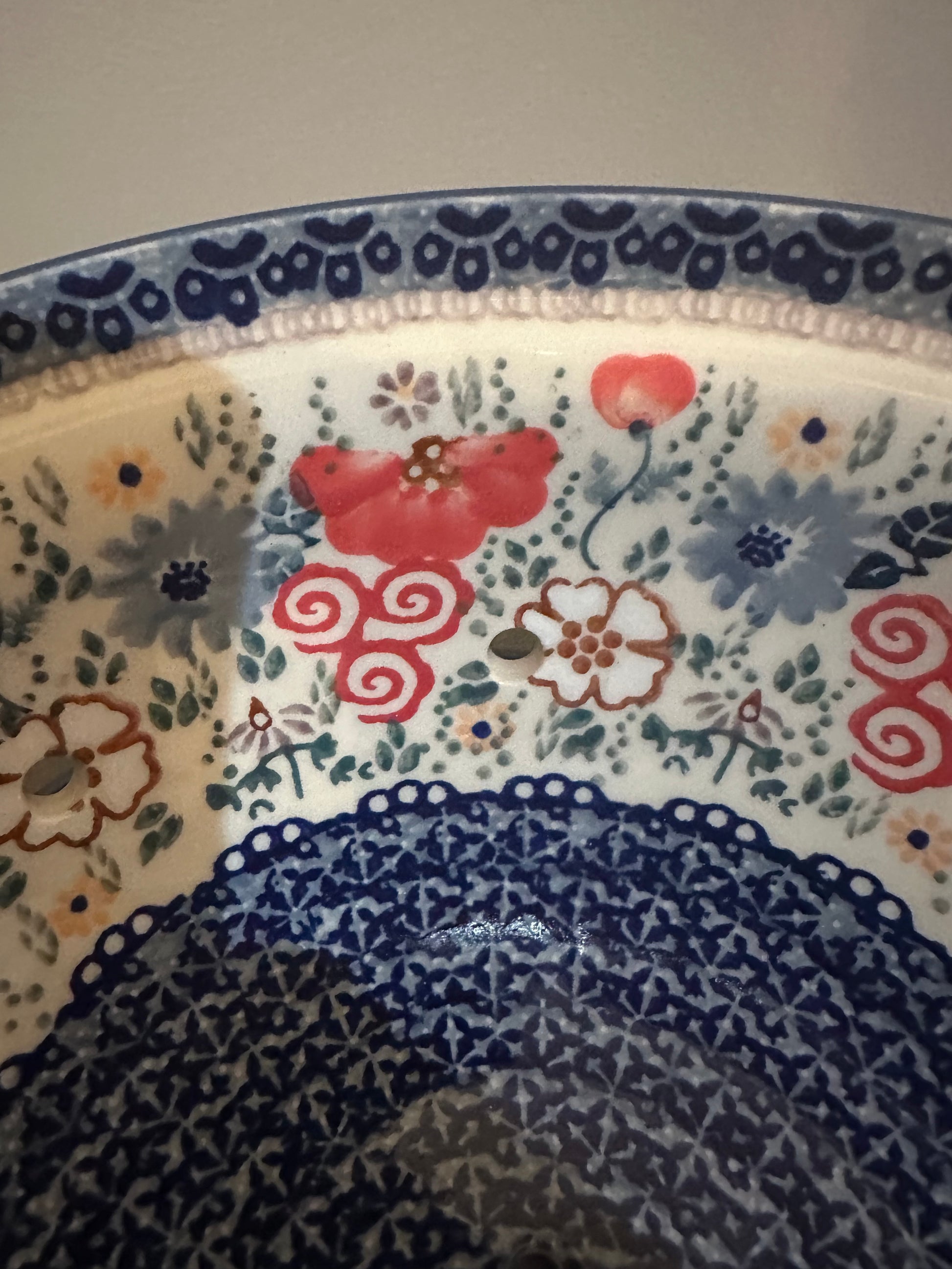 Manufaktura Factory. Sweet Pea, Large Colander with Plate. 9.5" x 4.5. Handmade and Hand Painted in Boleslawiec, Poland. Oven Safe to 480 degrees, microwave, dishwasher, freezer safe. No lead nor cadmium. Naturally Nonstick.