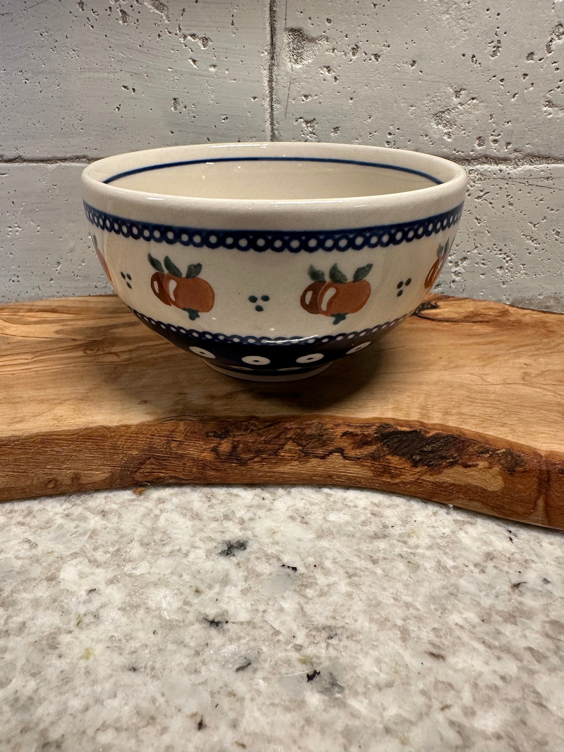 Zaklady Factory. Country Apple Bowl, 4.5" Diameter x 2.5". Handmade and Hand Painted in Boleslawiec, Poland. Oven Safe to 480 degrees, microwave, dishwasher, freezer safe. No lead nor cadmium. Naturally Nonstick.