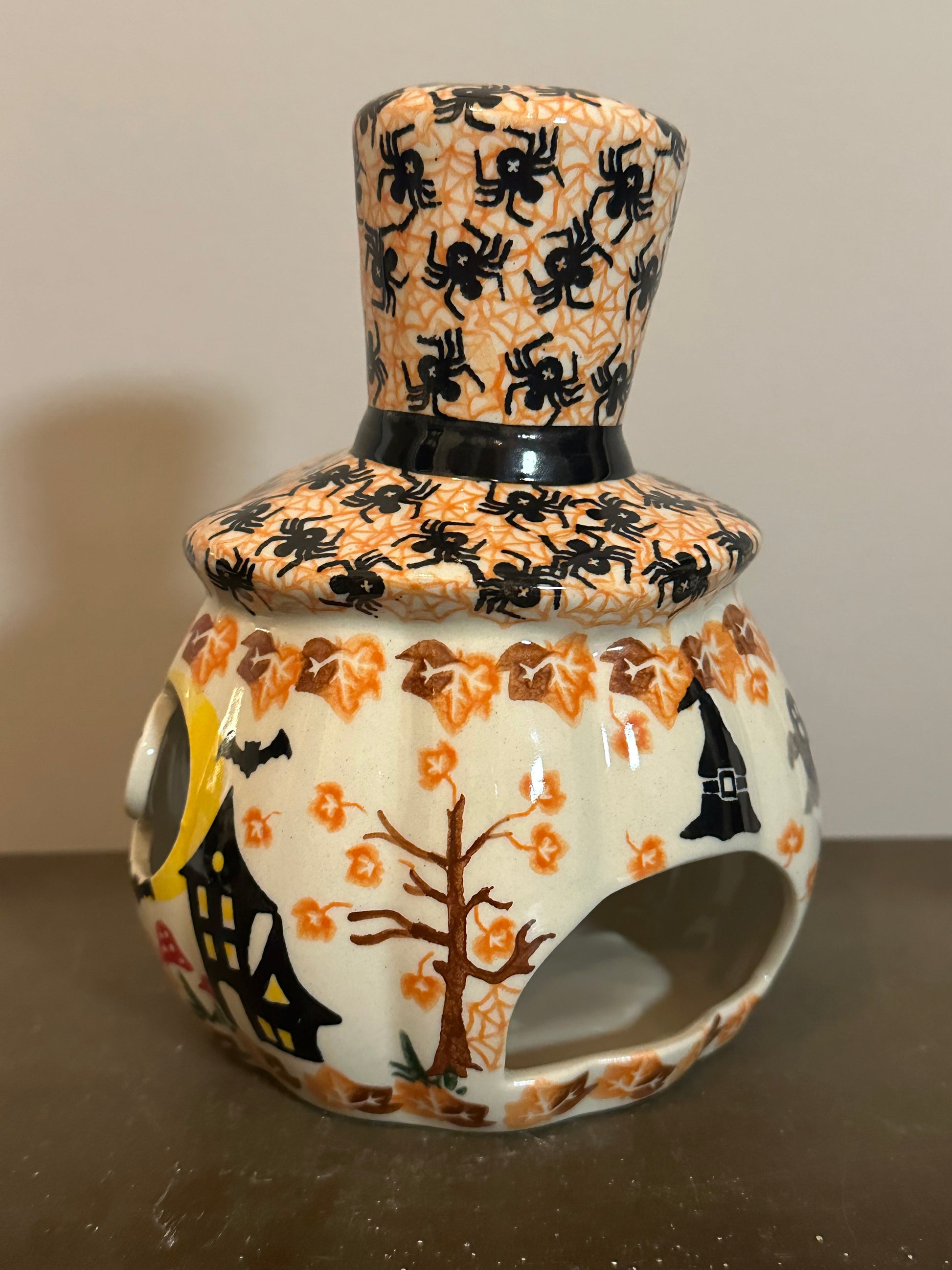 Vena Factory. Enchanted Pumpkin Jack'O'Lantern with Top Hat. 6.5" Diameter x 7.5" Tall. Handmade and Hand Painted in Boleslawiec, Poland. Oven Safe to 480 degrees, microwave, dishwasher, freezer safe. No lead nor cadmium. Naturally Nonstick.