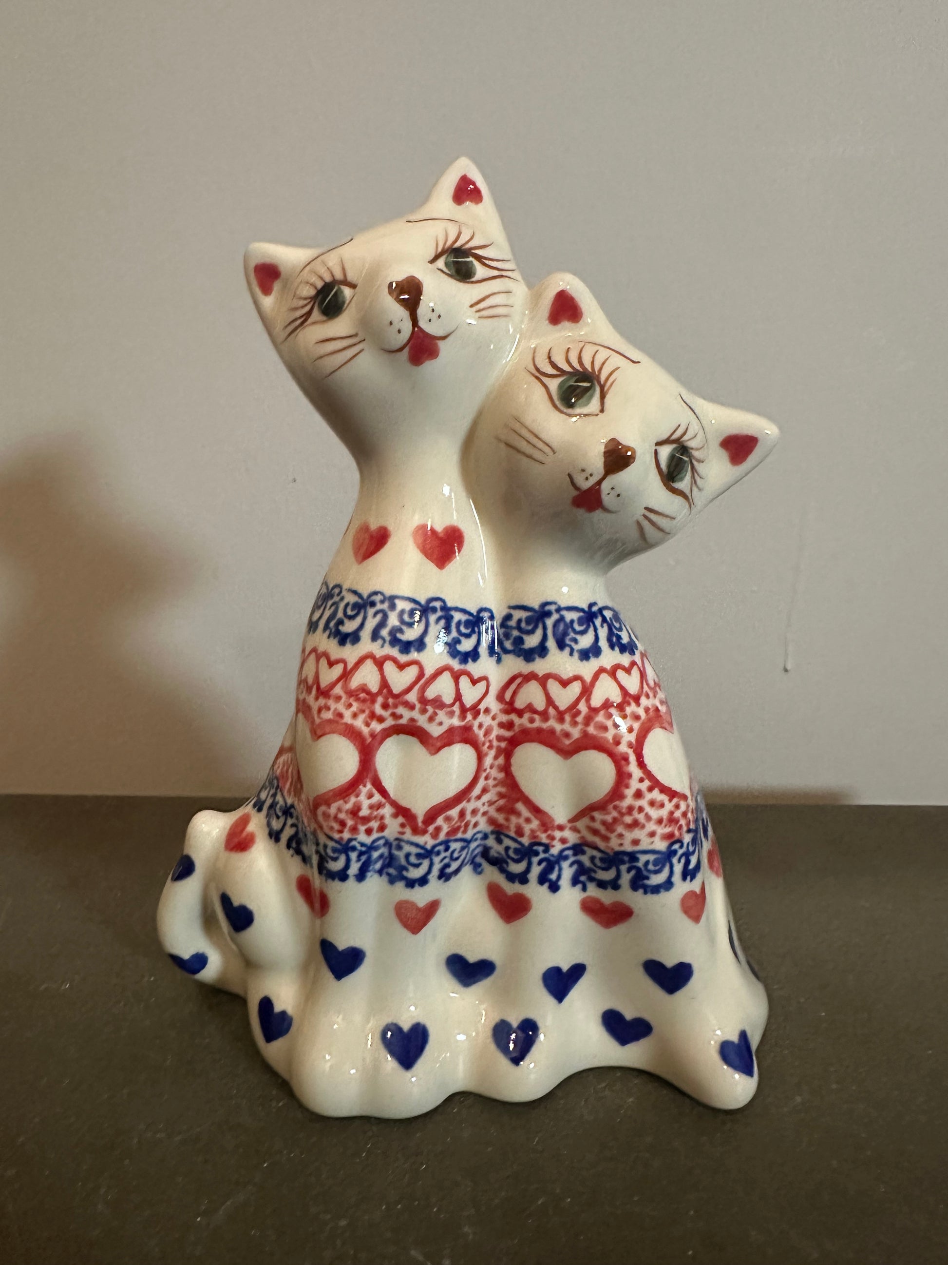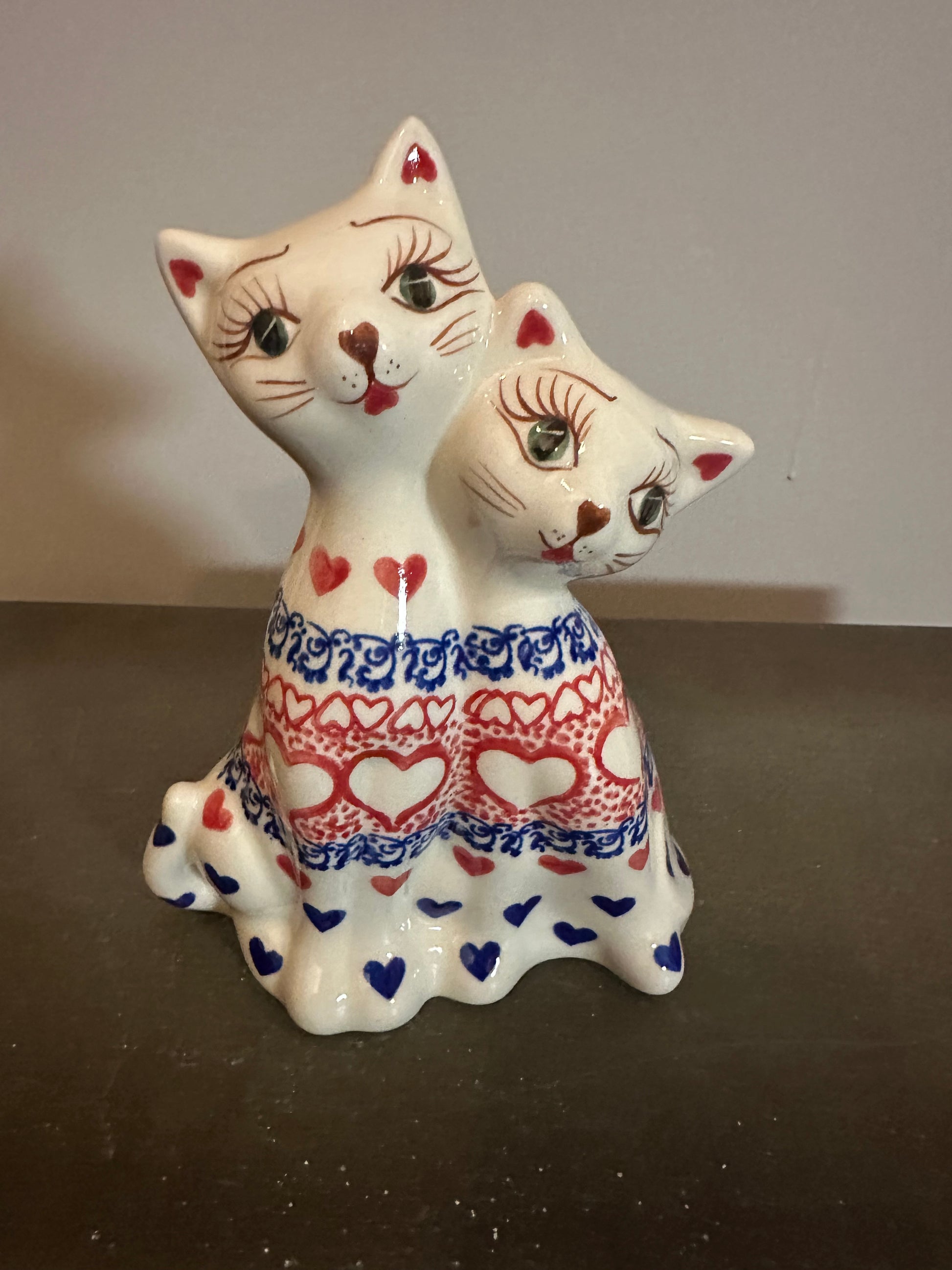 Vena Factory. Lovely In Lace, Cat Figurine. 7" x 5". Handmade and Hand Painted in Boleslawiec, Poland. Oven Safe to 480 degrees, microwave, dishwasher, freezer safe. No lead nor cadmium. Naturally Nonstick.