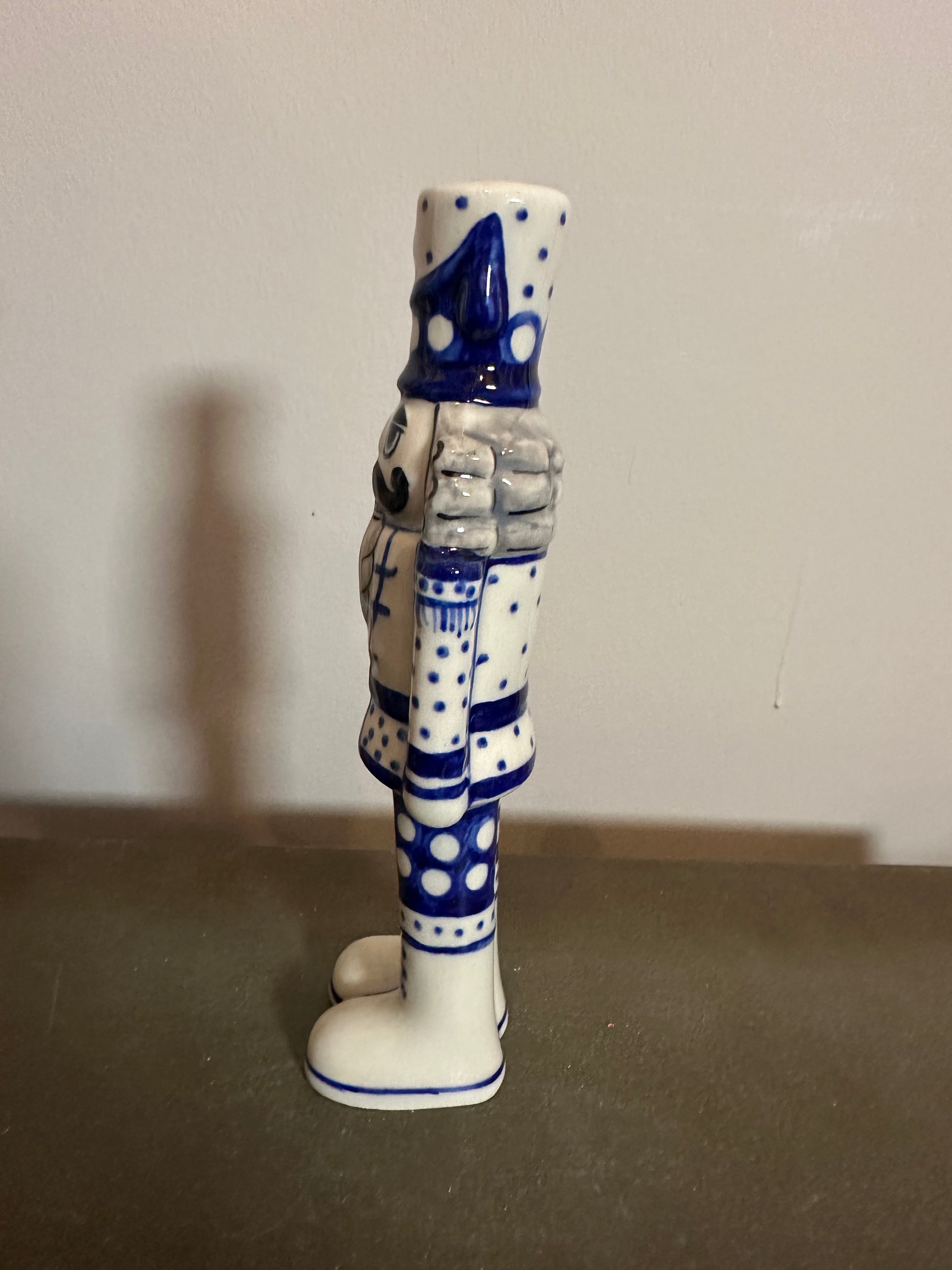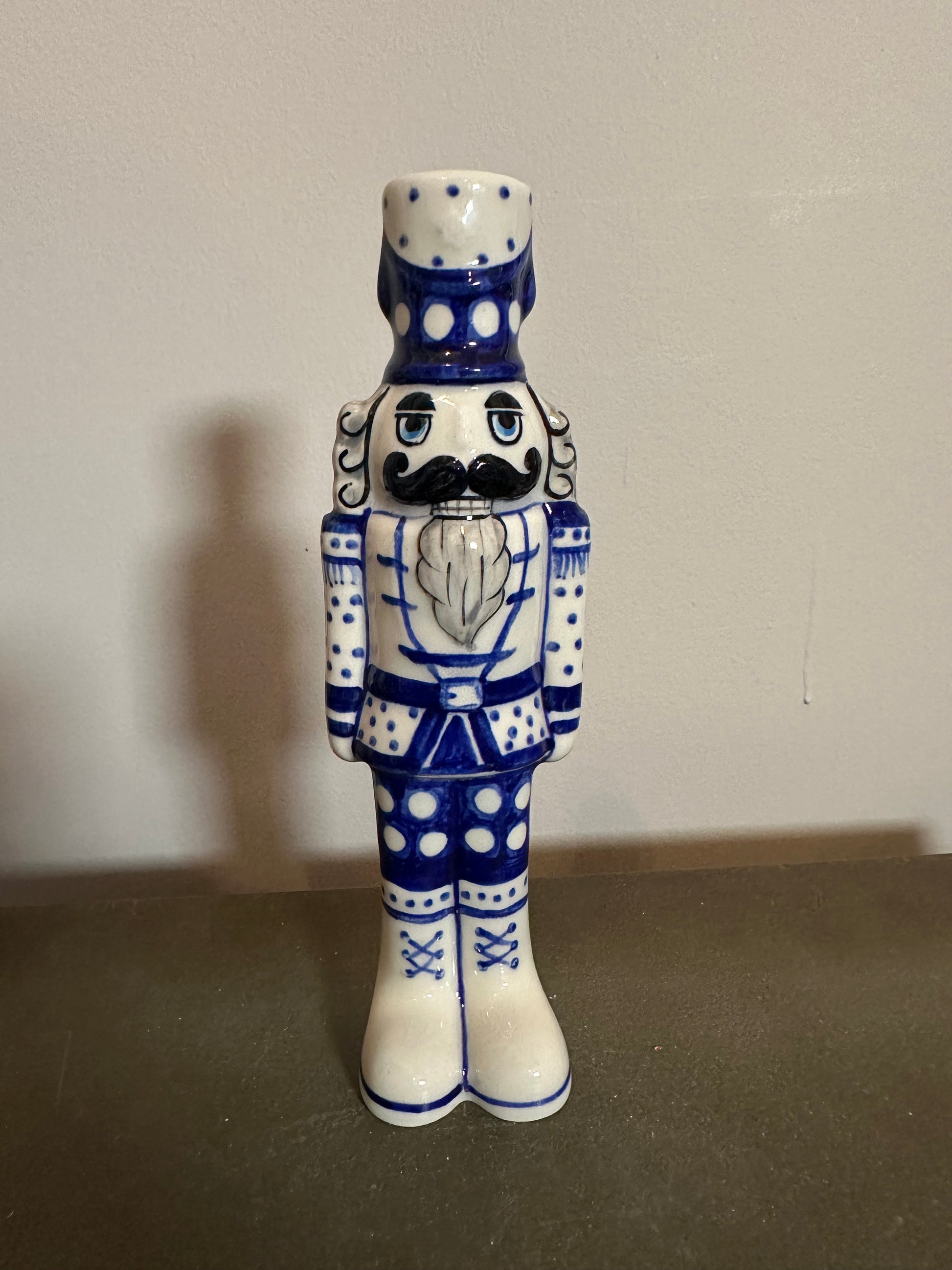 Vena Factory. Medium Blue & White Nutcracker Figurine, 8" Tall. Handmade and Hand Painted in Boleslawiec, Poland. Oven Safe to 480 degrees, microwave, dishwasher, freezer safe. No lead nor cadmium. Naturally Nonstick.