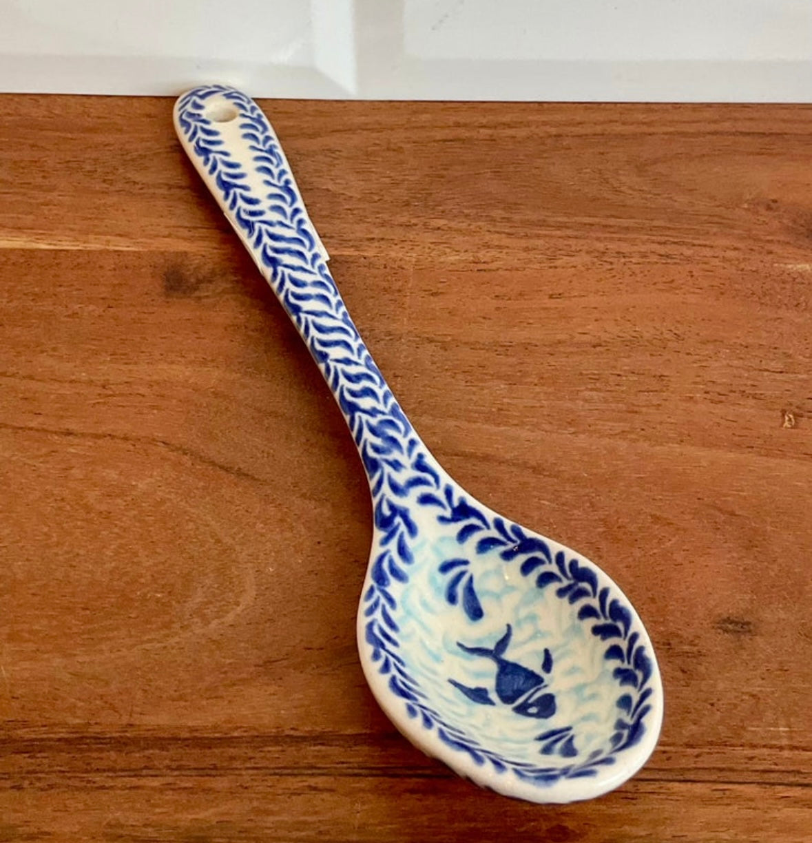 Vena Factory. Sailboats 8" Spoon. Handmade and Hand Painted in Boleslawiec, Poland. Oven Safe to 480 degrees, microwave, dishwasher, freezer safe. No lead nor cadmium. Naturally Nonstick.