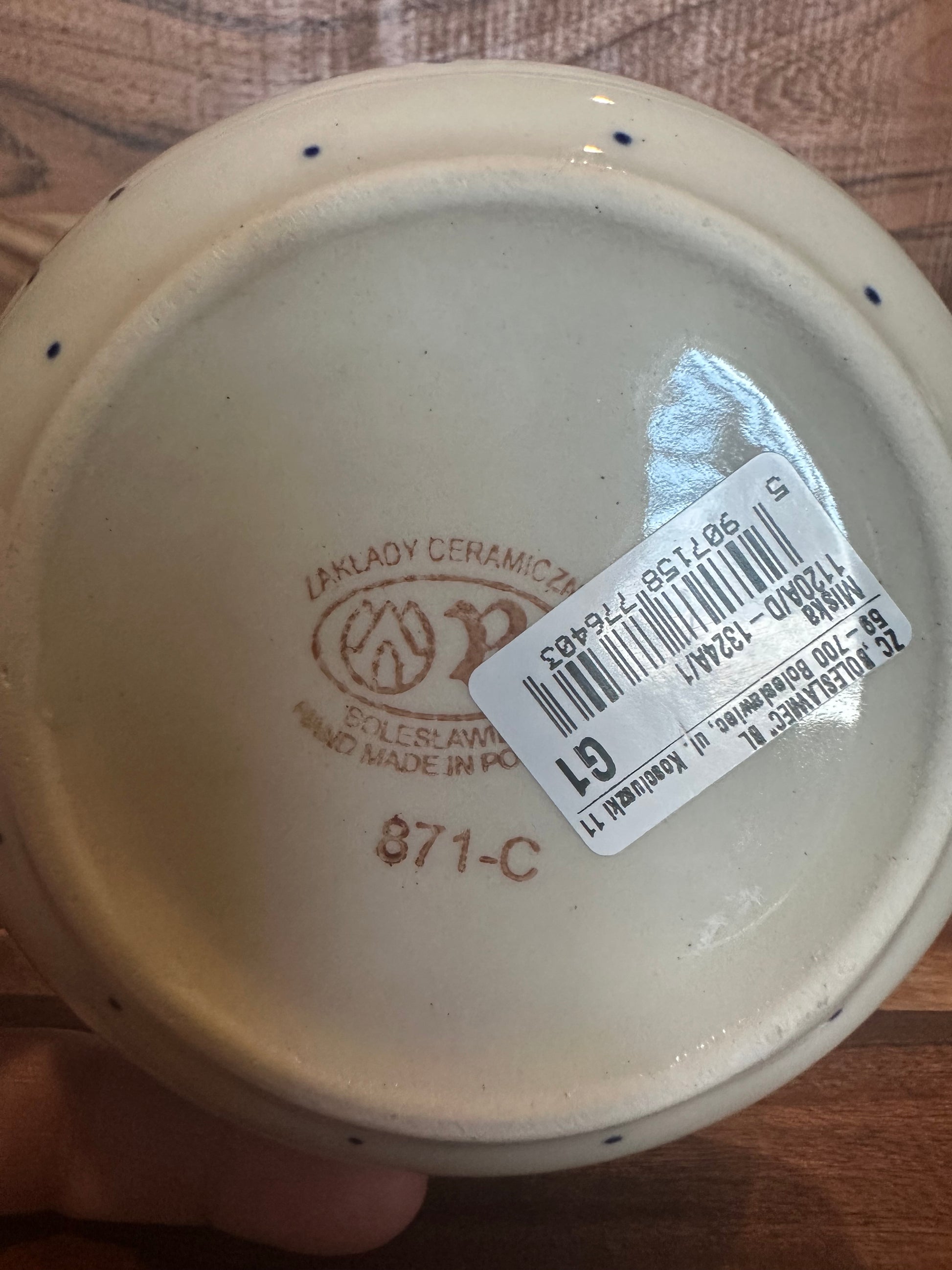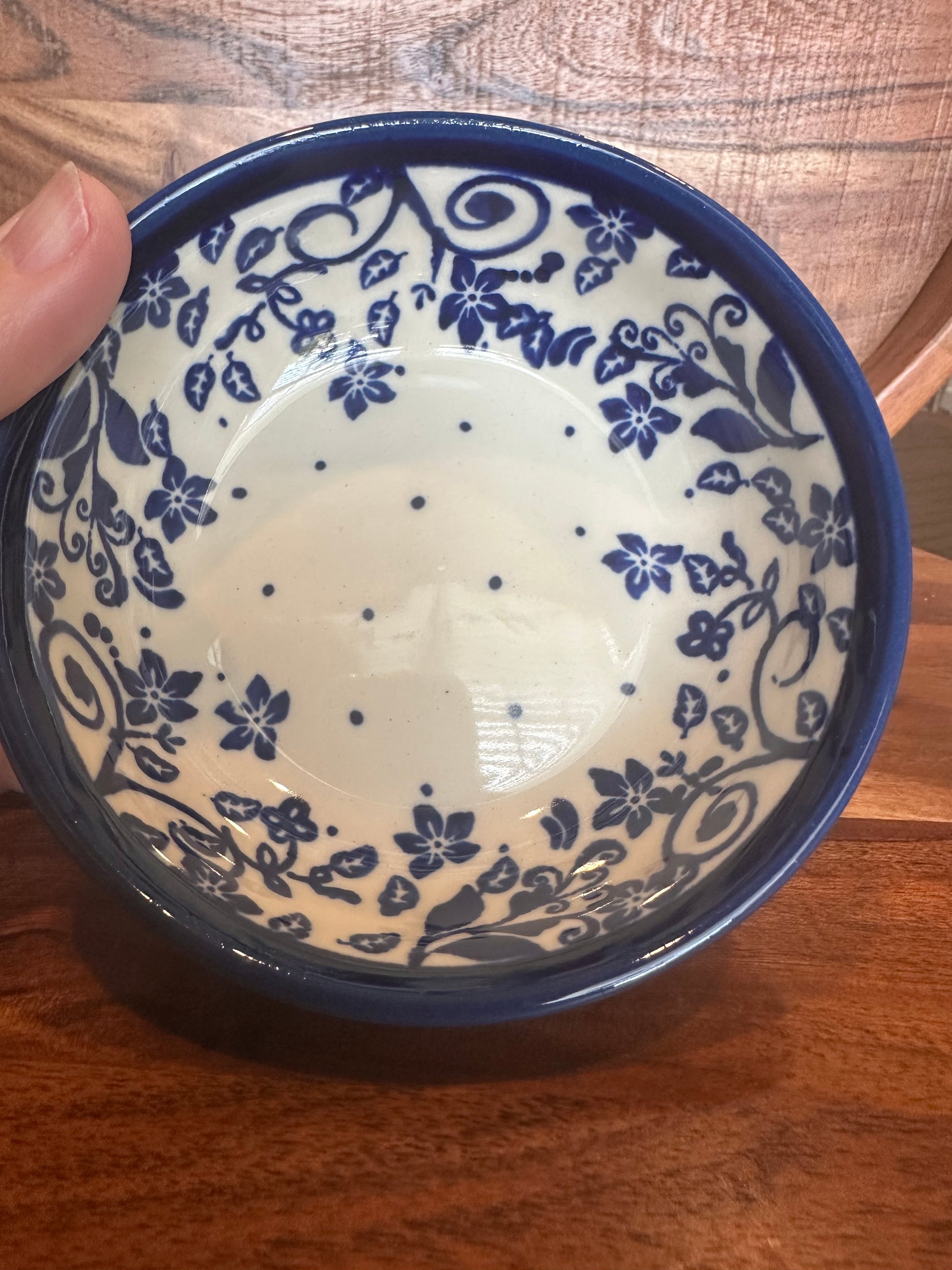 Zaklady Factory. Blue Ivy, Bowl. 4.75" x 1.5". Handmade and Hand Painted in Boleslawiec, Poland. Oven Safe to 480 degrees, microwave, dishwasher, freezer safe. No lead nor cadmium. Naturally Nonstick.