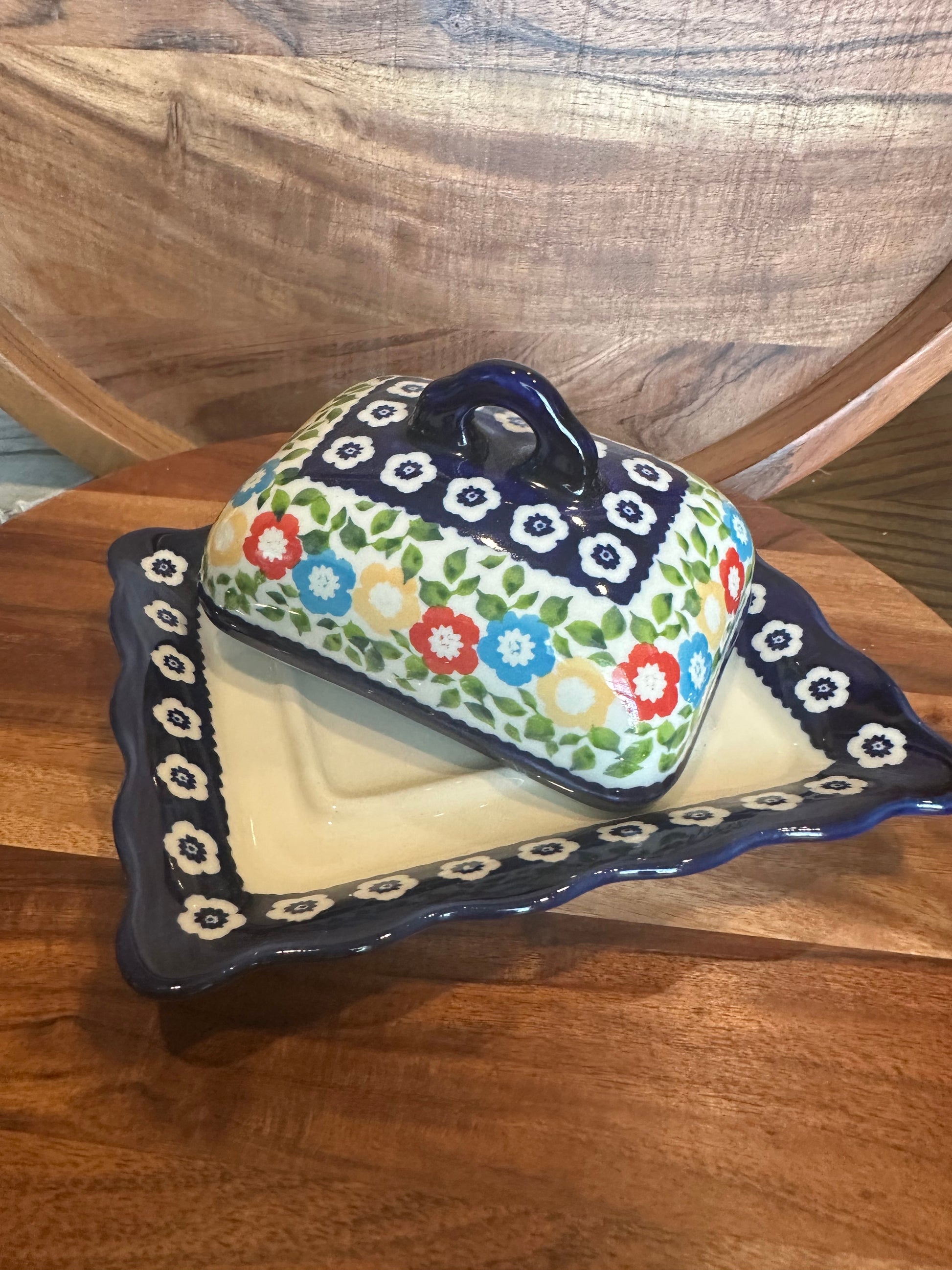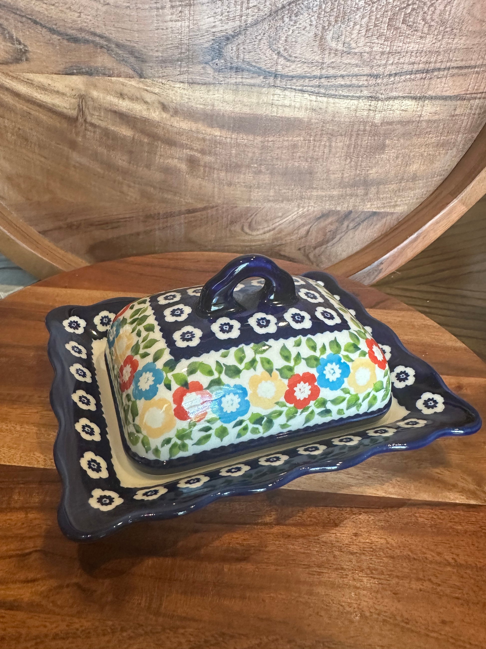 Zaklady Factory. Botanical Gardens Butter Dish. 5" x 7". Handmade and Hand Painted in Boleslawiec, Poland. Oven Safe to 480 degrees, microwave, dishwasher, freezer safe. No lead nor cadmium. Naturally Nonstick.