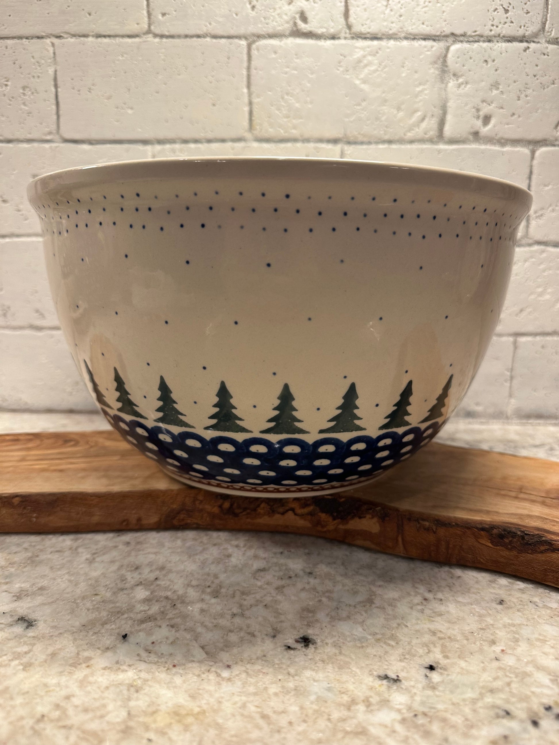 Zaklady Factory. Pine Forest, Large Mixing Bowl. 10.5" Diameter x 6.5" Tall. 4 Quart Capacity. Handmade and Hand Painted in Boleslawiec, Poland. Oven Safe to 480 degrees, microwave, dishwasher, freezer safe. No lead nor cadmium. Naturally Nonstick.