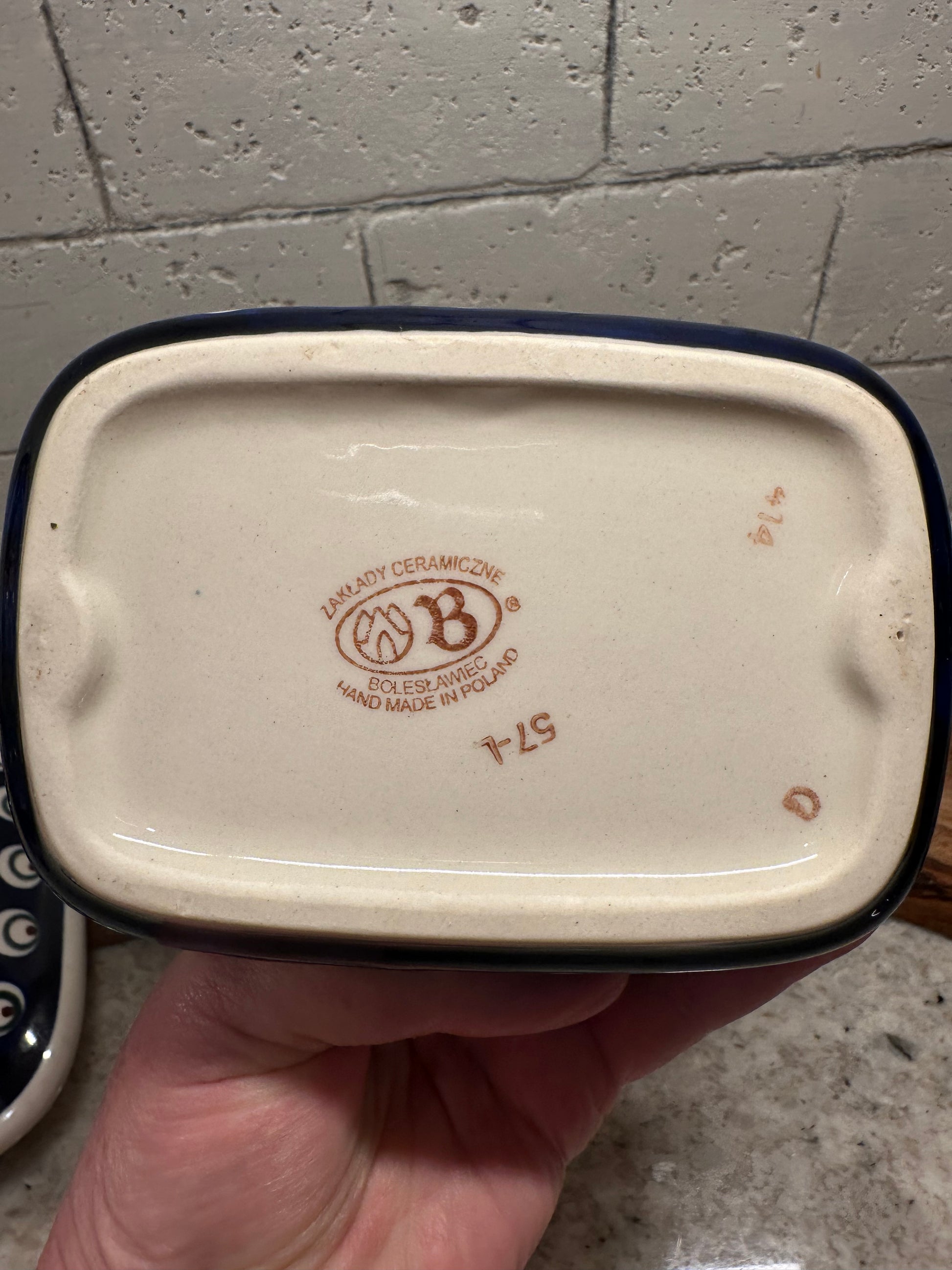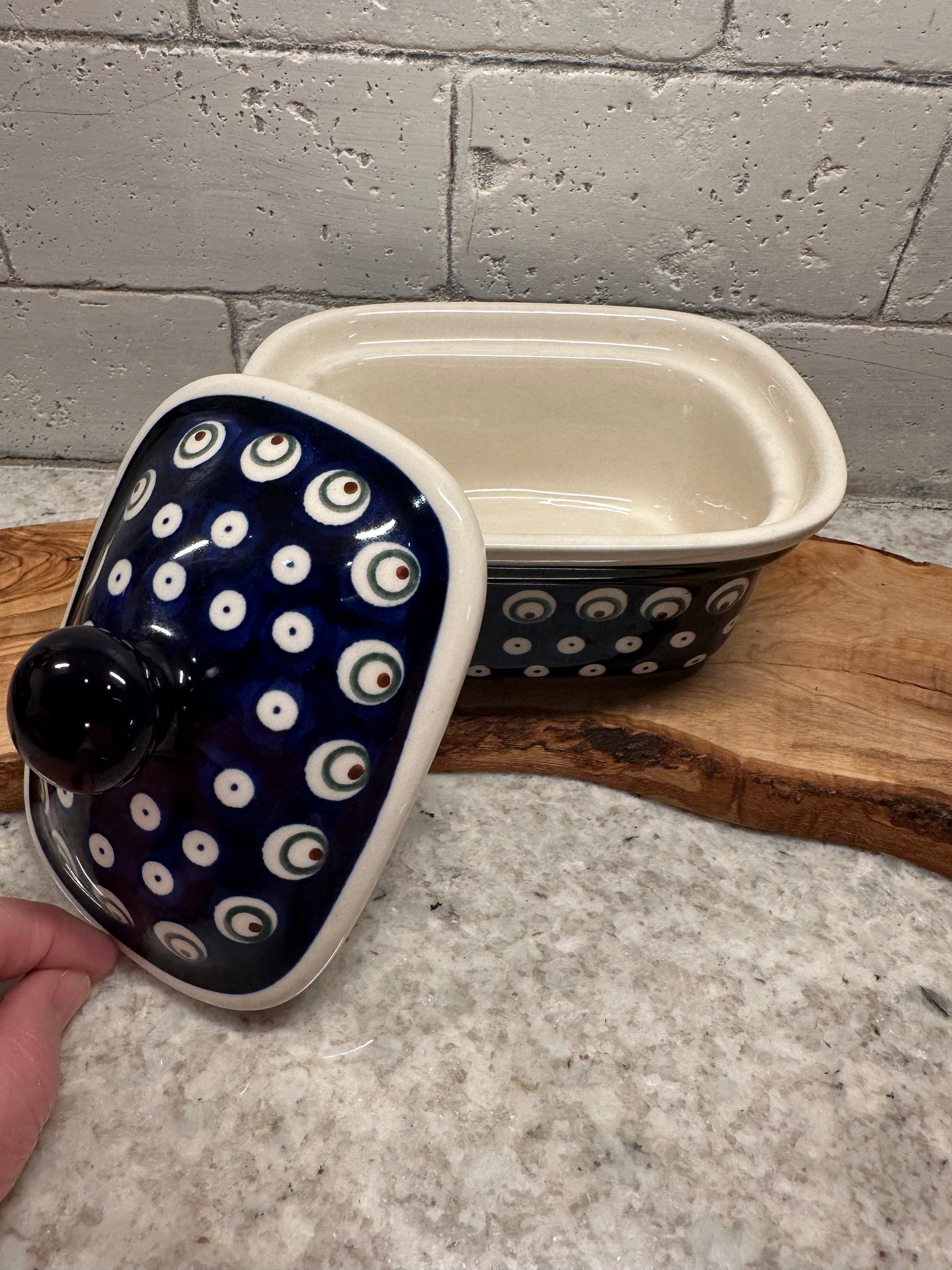 Zaklady Factory. Traditional Peacock, Butter Tub. 5" x 6.25" x 5". Handmade and Hand Painted in Boleslawiec, Poland. Oven Safe to 480 degrees, microwave, dishwasher, freezer safe. No lead nor cadmium. Naturally Nonstick.